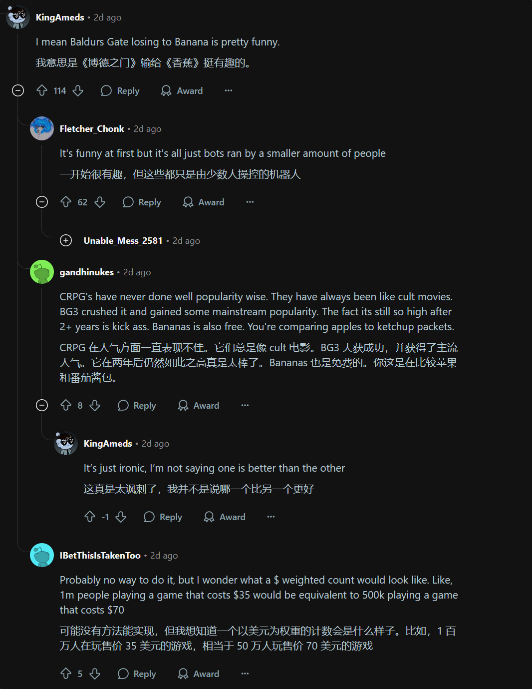 也有部分玩家惋惜《博德之门3》竟然输给了《Banana》,不过CRPG一向小众,就像Cult片(往往剑走偏锋,但有一群小圈子的人的追捧推崇、收藏的“非主流”电影)一样。而且这两个对比并不公平,因为《Banana》免费游玩,BG3售价并不便宜(但很值)。