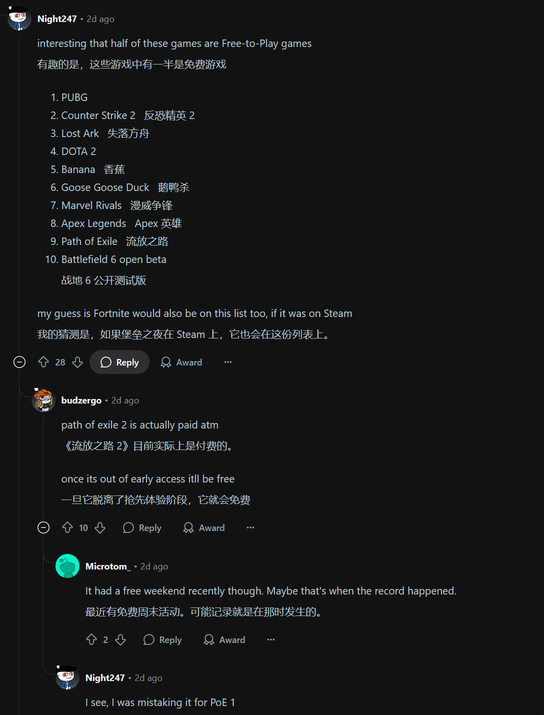 也有玩家表示这份上榜的名单里大多均为免费游戏,像是《PUBG》,《CS2》,《鹅鸭杀》,《漫威争锋》,《流放之路2》等。他认为如果《堡垒之夜》(Fortnite)登录Steam,那大概率也会上榜。