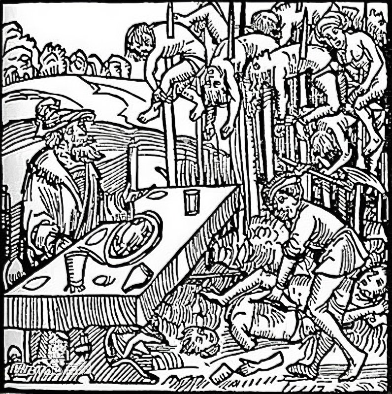 瓦拉几亚大公弗拉德三世(德古拉原型)以“穿刺公”之名留名历史。他特别嗜好用木桩穿刺活人,曾一次穿刺两万土耳其战俘。宴饮时,他喜欢在垂死挣扎的受刑者中间用餐,认为惨叫是最好的佐餐音乐。
