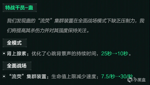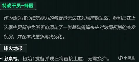 双模式下减少了开启肾上腺素时心跳声debuff的持续时间,同时加强了战场模式下大招命中的扣血速度。本质上是对烽火地带加强,大战场有蜂医就够了。