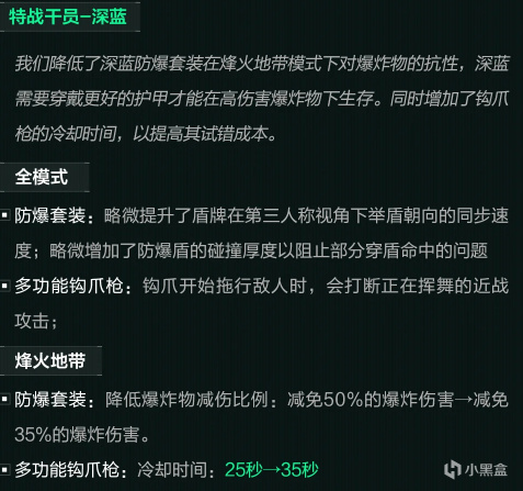 烽火地带:降低了爆炸减伤由原来的50%下调为35%,以后有更严厉的父母(老黑、露娜)来教育你了!同时还增加了钩爪10秒CD。