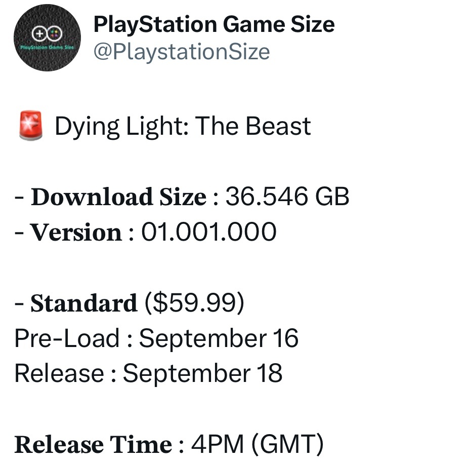 《消逝的光芒:困兽》PS版本:预载将于 9 月 16 日开启,9 月 18 日正式发售;标准版定价 468 港币,豪华版定价 568 港币;本次下载大小约 36.546 GB,版本号为 01.001.000。