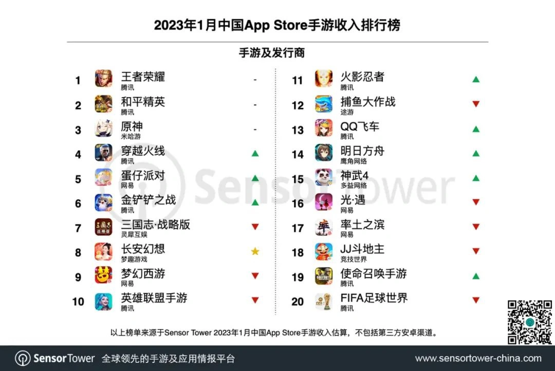 除了前文提到的《蛋仔派对》和《长安幻想》,本期收入实现大幅增长的还有《穿越火线: 枪战王者》和《明日方舟》。《穿越火线: 枪战王者》凭借开年扭蛋机活动和新春版本在 1 月疯狂吸金,仅仅一个月收入就环比增长 173%,创历史新高,也使其首次进入榜单前 4 名。除此之外,鹰角头牌《明日方舟》在春节限定活动的带动下收入环比增长 228%,从而使其重回中国手游发行商收入榜第 30 名。