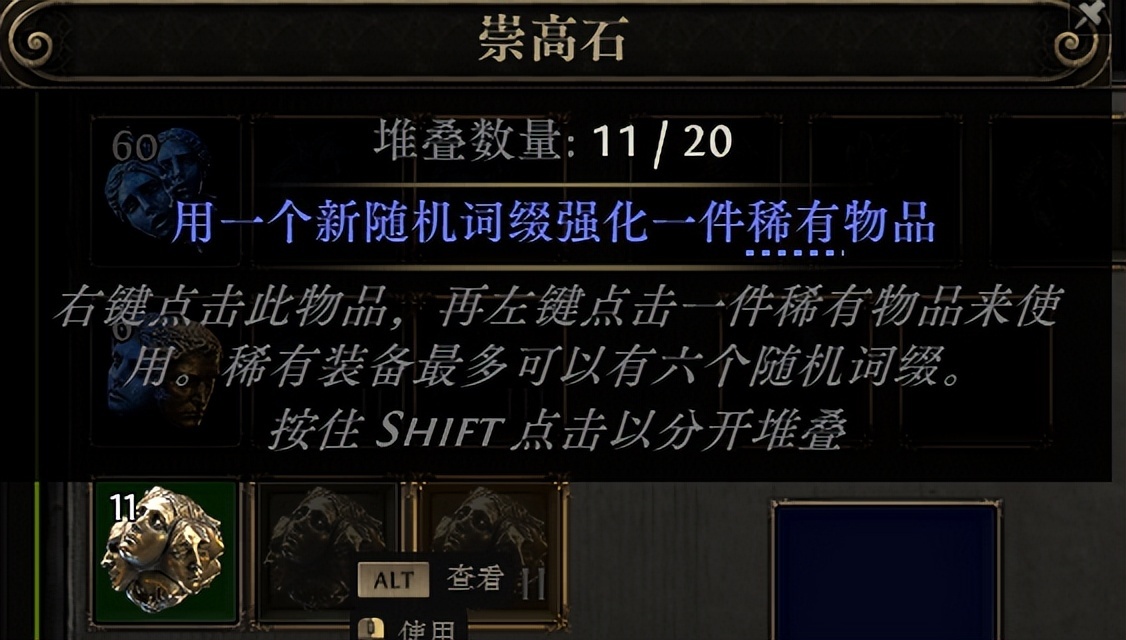 崇高石我们俗称E,为一件稀有物品(黄装) 新增一项随机词缀,也是全游戏三大硬流通货之一,等级5级之后就有几率掉落,后期装备制作的关键材料。前期非常珍贵,不建议使用,尽量存起来。
