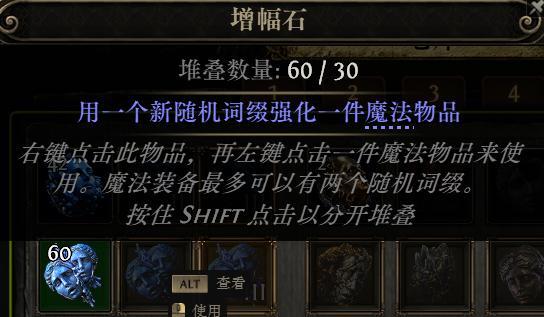 蜕变石的效果类似,是将白装变为蓝装。这两一联动就诞生了一种做装备的思路,在商店购买或打怪掉落适合自己的底材(白色或蓝色装备),对普通(白装) 装备使用蜕变石将其变为魔法(蓝装) 物,词缀合适就用增幅石点出第二个词条,对两条词缀都满意的蓝装使用富豪石将其变为稀有(黄装) 物品,如果结果满意,再用使用崇高石为其新增一条词缀。