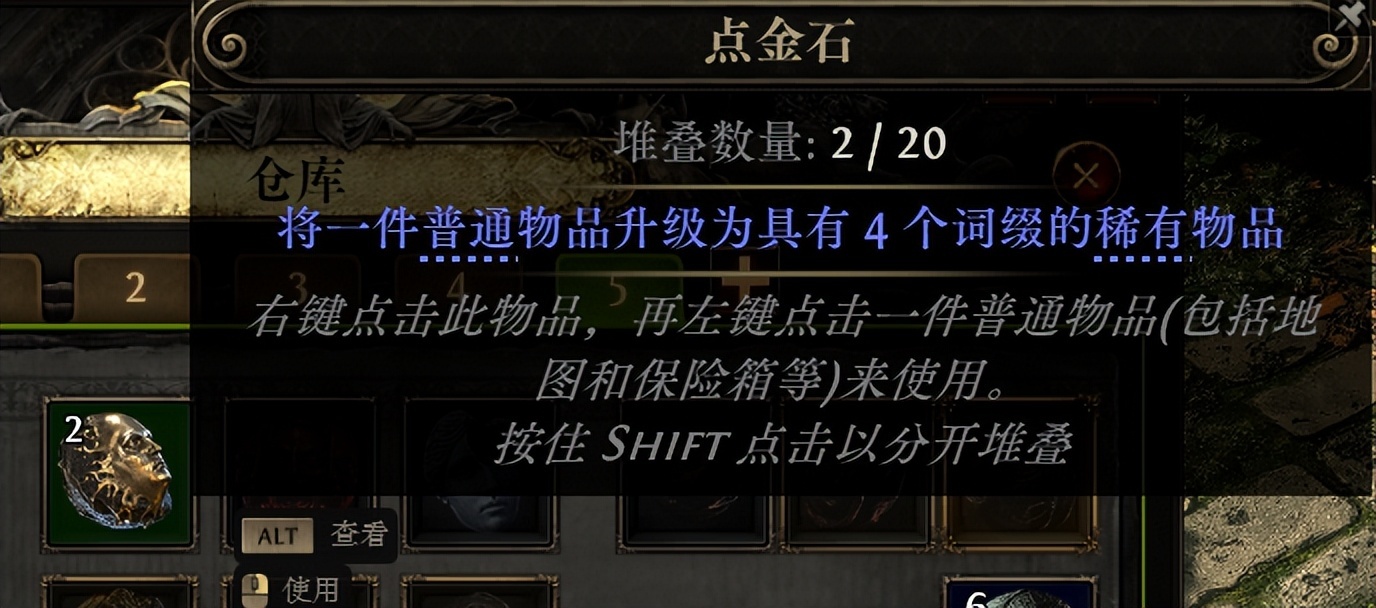 顾名思义就是点金,可以将将一件普通(白装) 物品直接升级为稀有(黄装) 物品(带有数条随机词缀)。开图必备(将普通地图点成稀有地图以获得更多收益),也是快速获取一件可用黄装的最直接方式。
