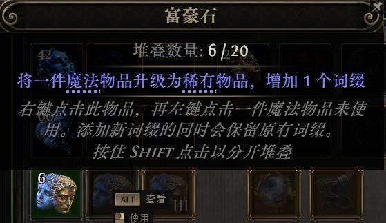 富豪石是将一件魔法物品(蓝装) 升级为稀有物品(黄装) 并新增一条词缀,也是非常看脸的。