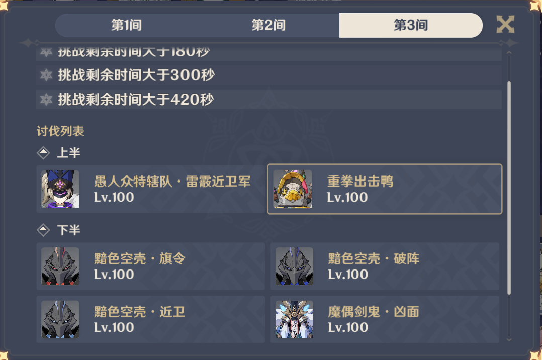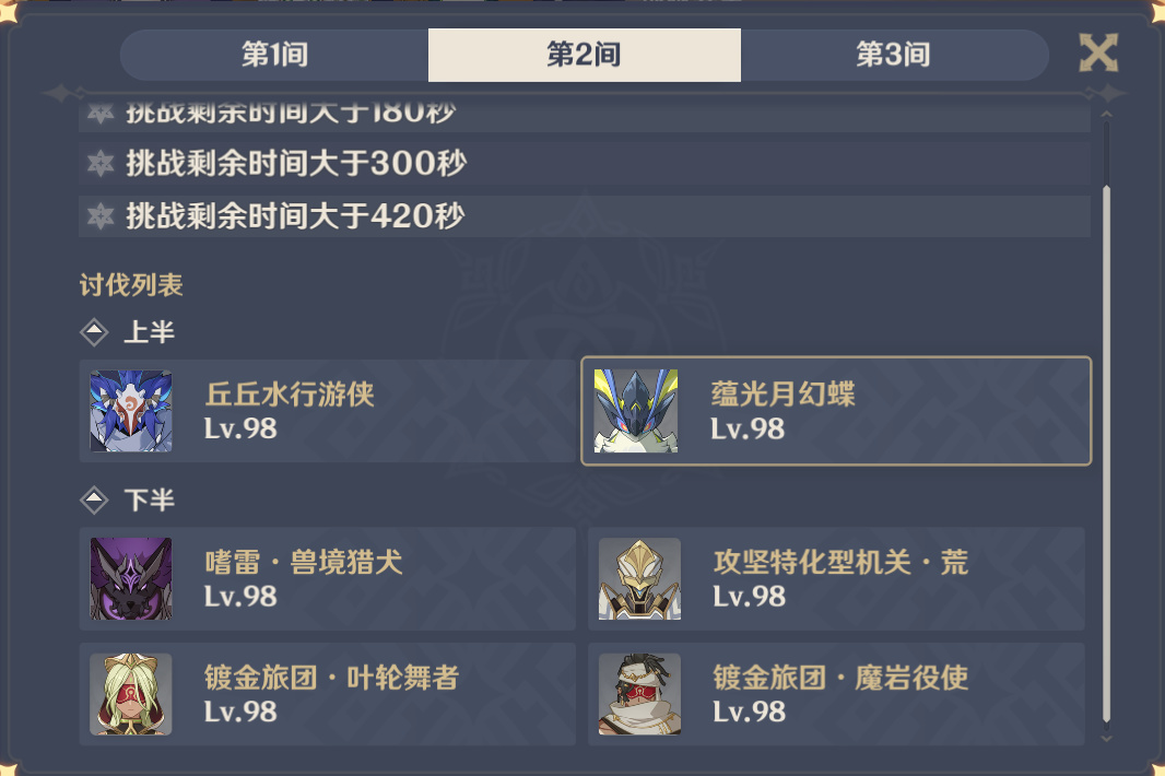 第二間上半也是分兩波怪,這裏需要注意的是上半需要帶個羣奶破處機制,不過這個機制是四個角色單獨計算,其實只要主C自己破了就行了,不過能自己回血的主C太少了這裏還是推薦愛可菲,琴,夏洛蒂,心海等等