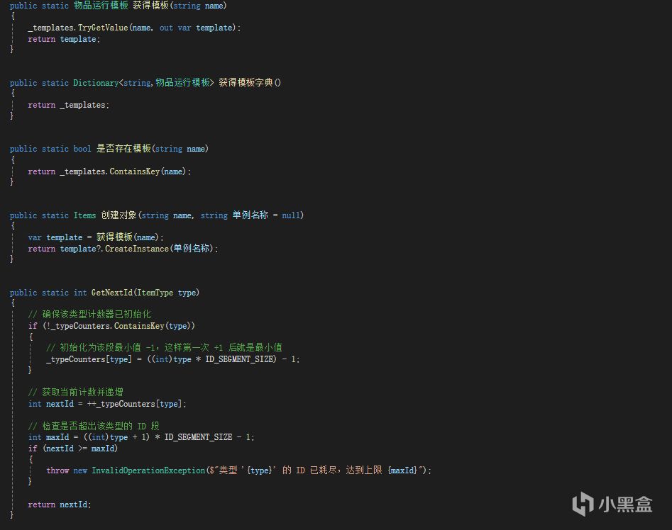 這一步,使用圖中的註冊方法將運行模板註冊到運行模板庫(字典)內,同時,嚴格設置模板的ID號(根據上述圖中的特殊枚舉屬性TypeItem來完成了保證物品的ID爲xxxxx形式,每兩種相鄰物品類型之間的ID序號差爲10000)。
