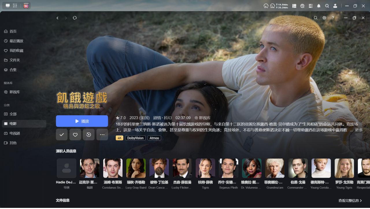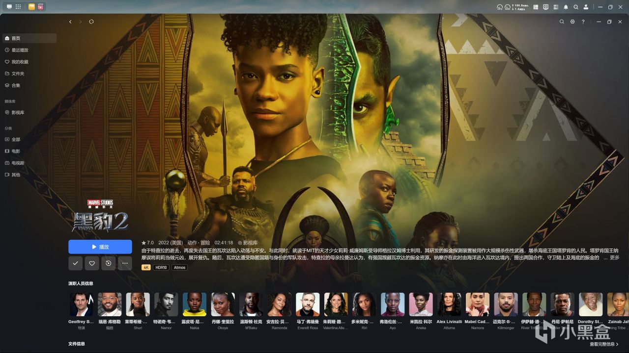 测试过程中,播放《黑豹2》4K、HDR10、杜比全景声版本和《饥饿游戏:鸣鸟与游蛇之歌》4K、杜比视界+杜比全景声版本,动辄40GB的文件都能流畅运行。