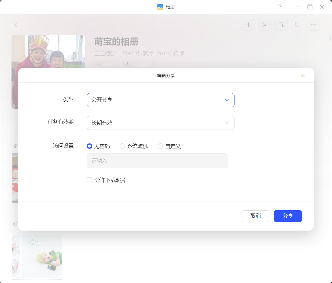 共享功能让家庭成员之间照片分享变得更加简单。创建共享相册后,多个用户都可以添加自己的照片到同一相册中,形成家庭共同的回忆库。对于外部分享,可以生成分享链接并设置有效期和密码,确保隐私安全。