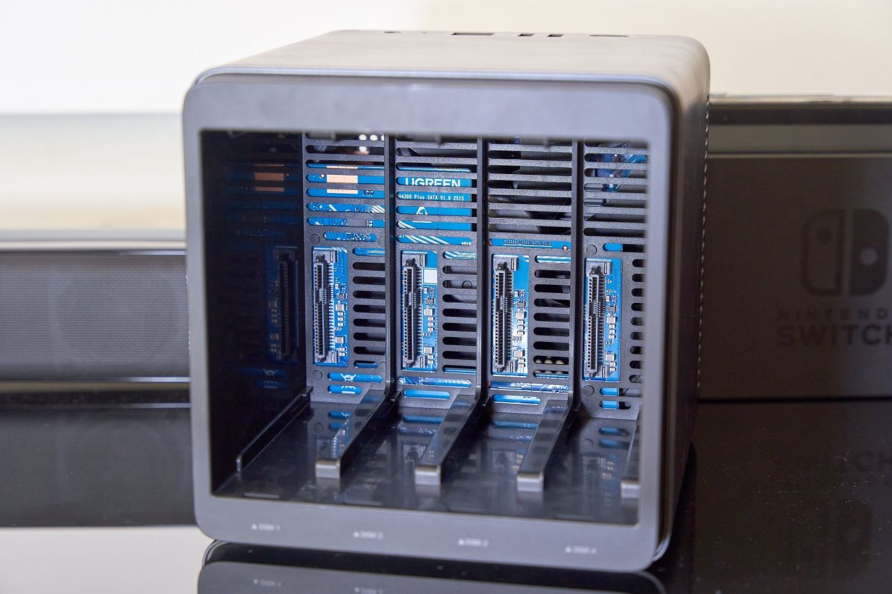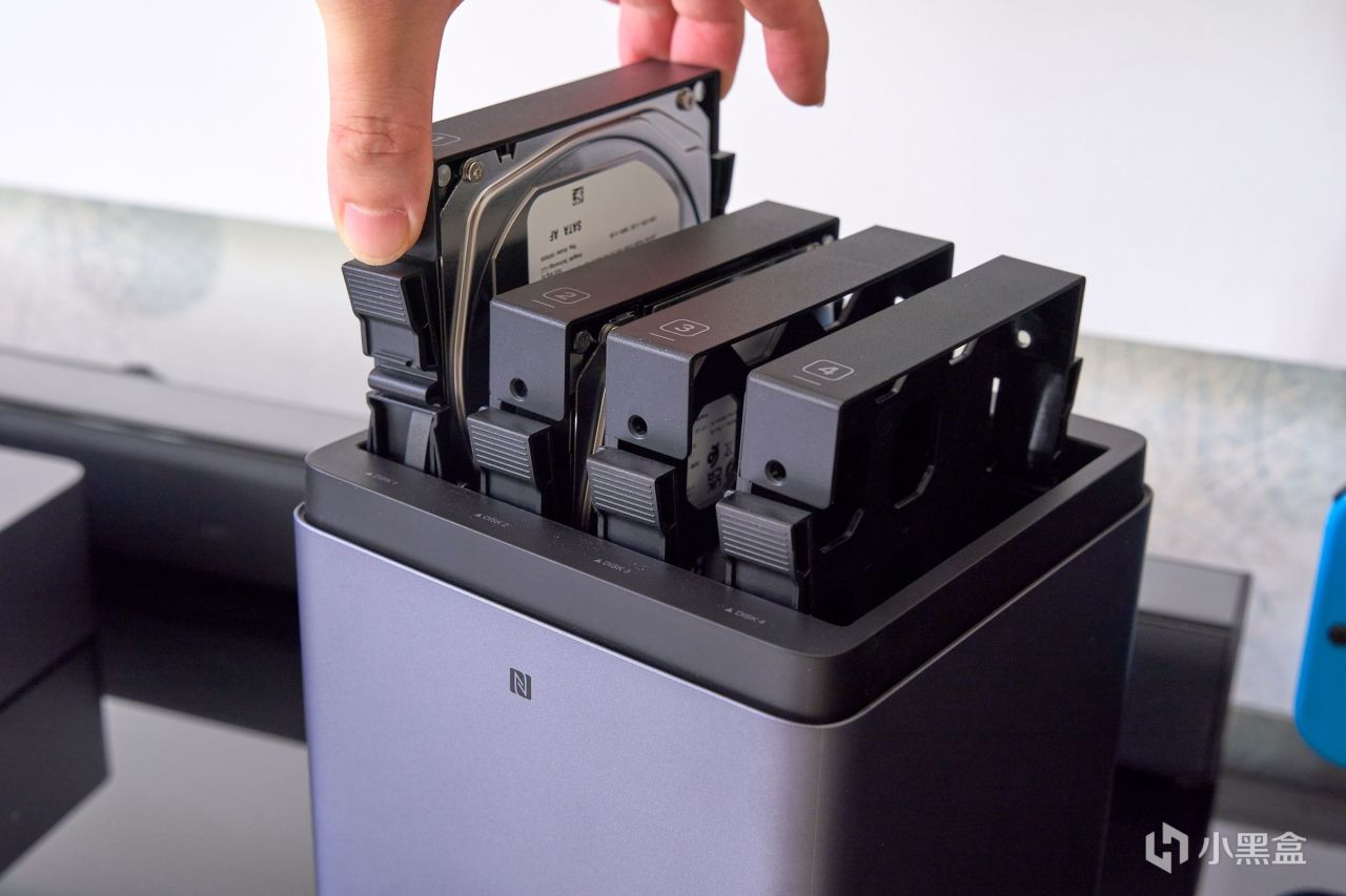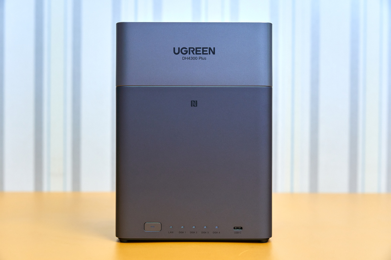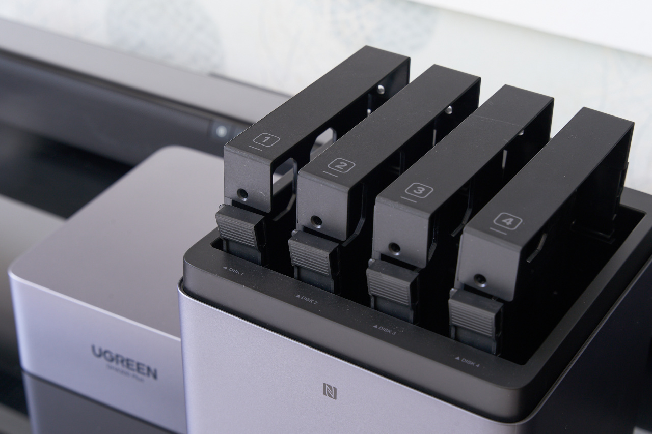 磁吸式顶盖是DH4300 Plus的设计亮点之一,揭开后即可看到四个硬盘位。在正面”UGREEN”logo 下方有个小小的NFC标识,那里是NFC芯片识别区,便于移动设备一触即联。