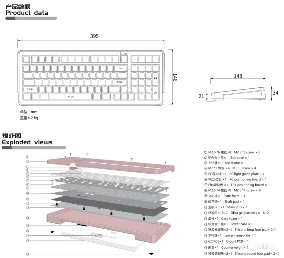 产品外观尺寸长宽为395*148mm,前高&后高为 21mm & 34mm。