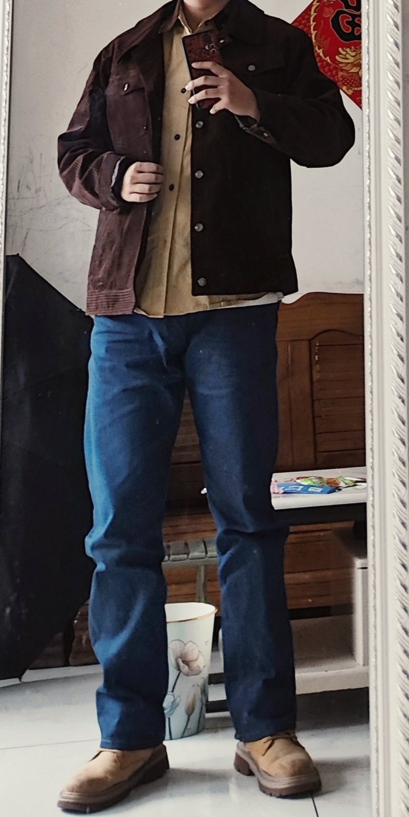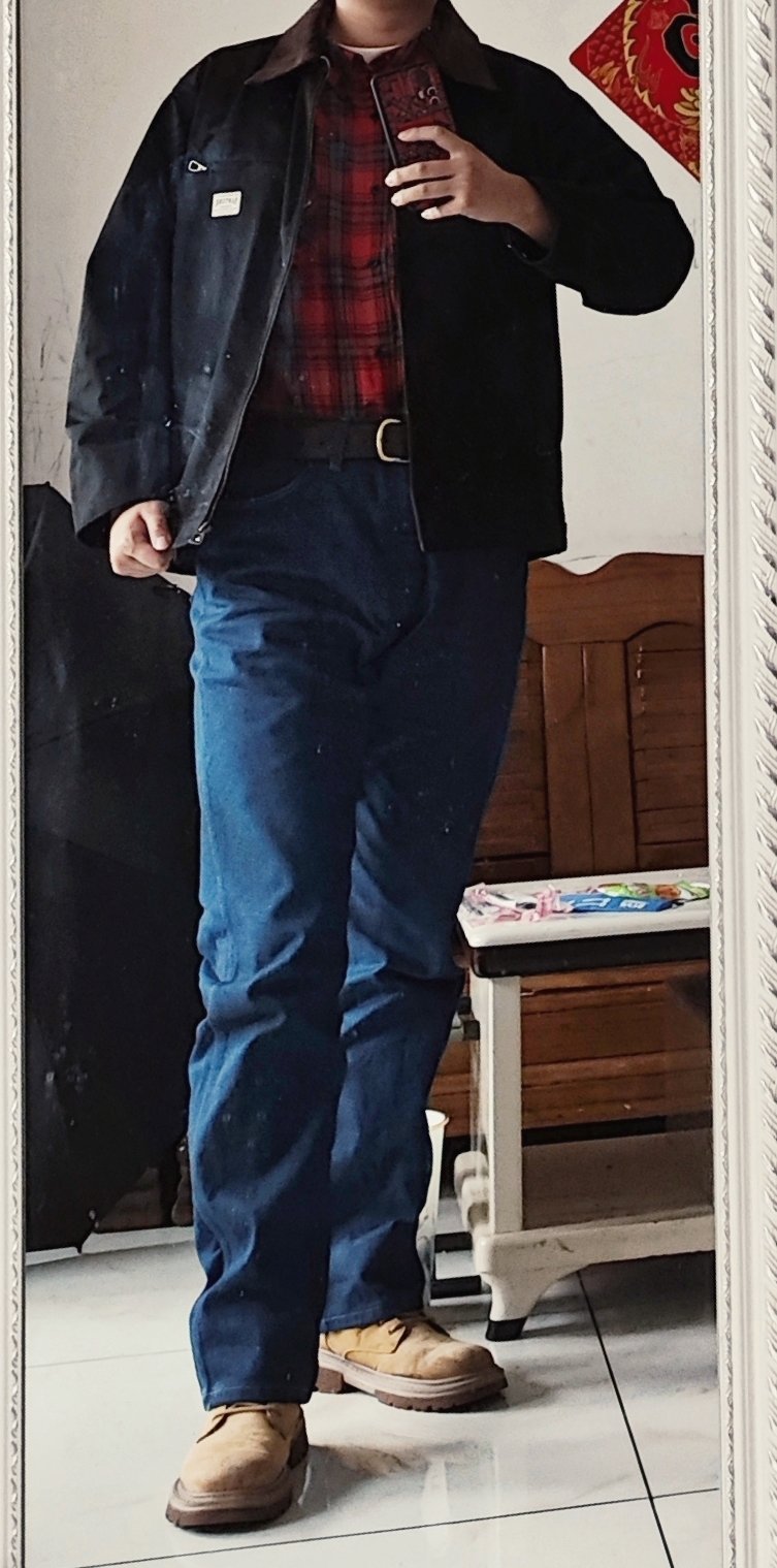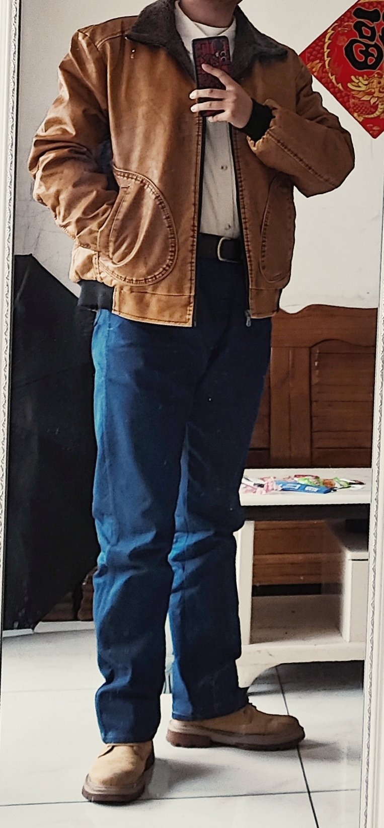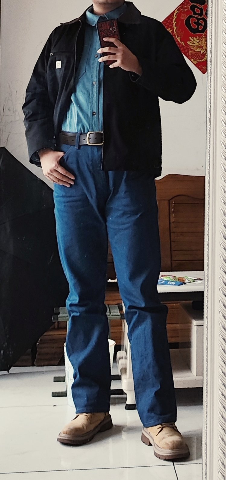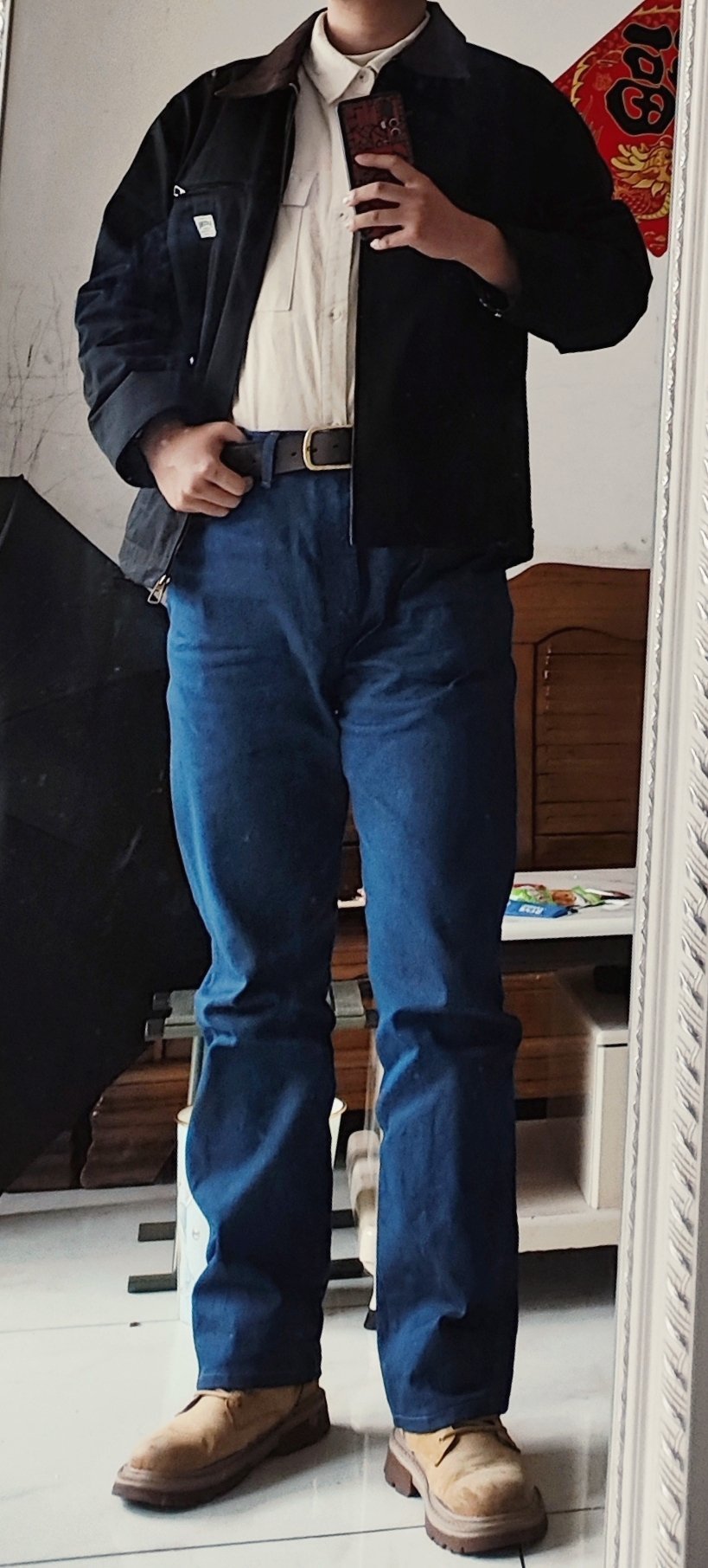 脫漿前115cm,脫漿後大概110cm,整個褲子偏寬鬆,但是不拖沓。外套是上彈工裝的底特律夾克,極其推薦,只需59元,超級重磅,面料細膩,外形硬挺,質量不輸馬登家的200多的底特律夾克。只不過買斷嗎了,只有黑色。