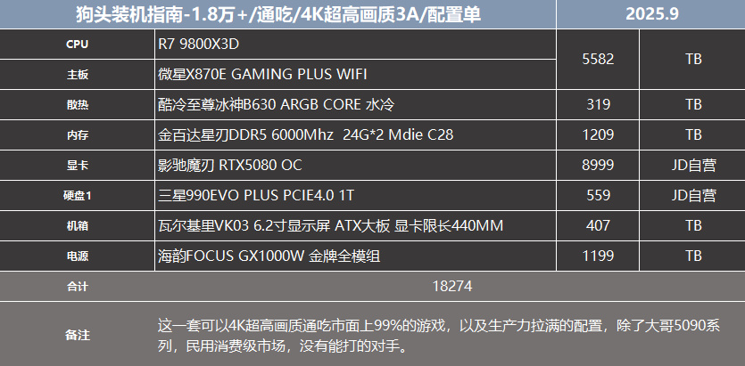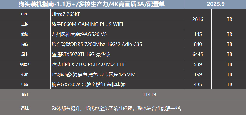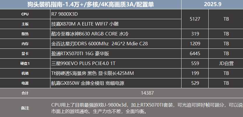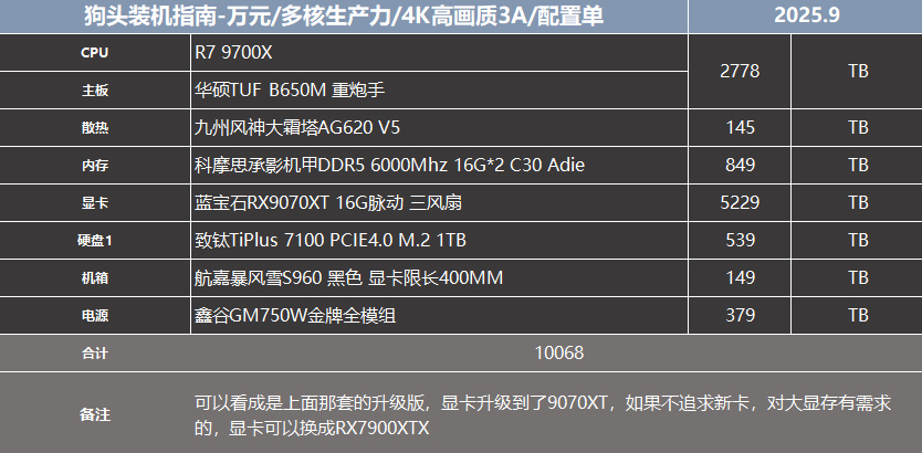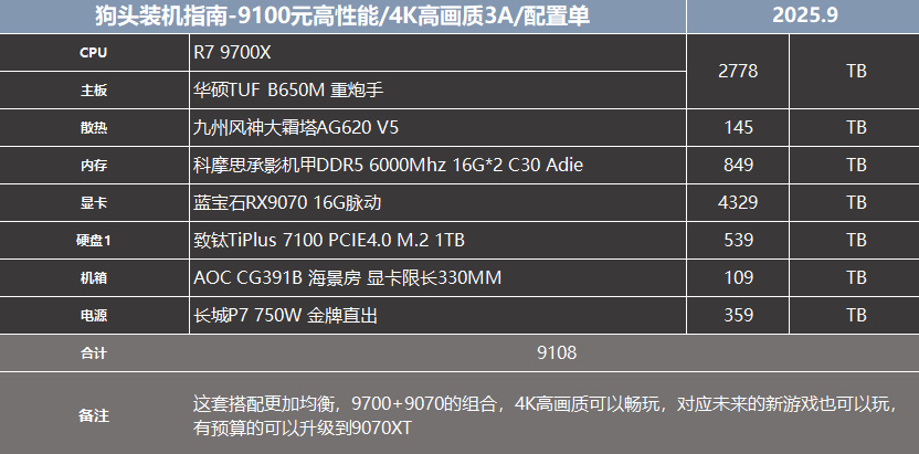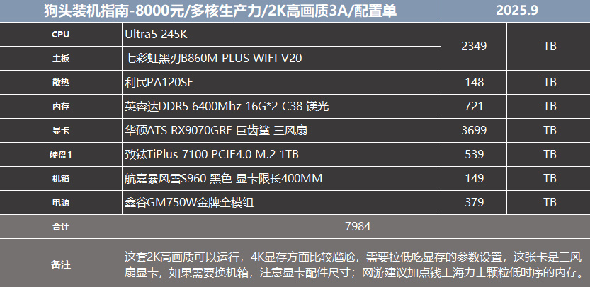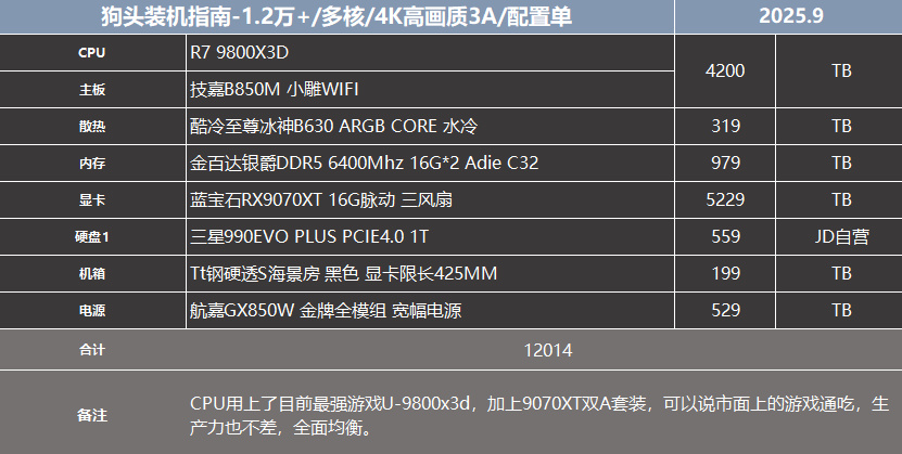 缺点:这套说起来也很均衡,不过思路上类似高显低U,玩3A更建议买9070GRE,价格都差不多,9070GRE对标的是RTX5070。