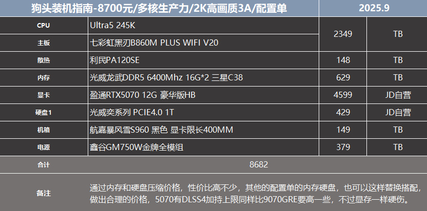 8700 元 / 多核生产力 / 2K 高画质 3A 配置单