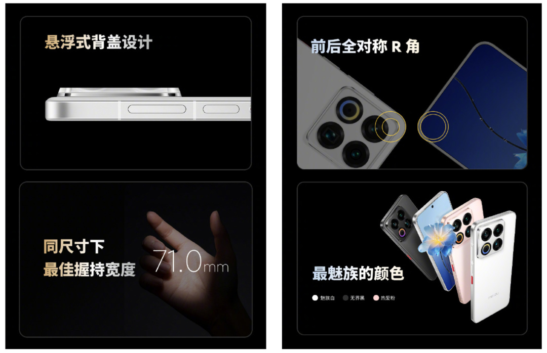 外觀的其他方面,魅族 22 整機的寬是 71mm ,據官方所說符合黃金握持寬度;背蓋首創了一個懸浮式設計,讓等深四曲面的玻璃背蓋略高於邊框,解決了硌手感;還有前後全對稱的 R 角、 50:50 的黃金配重。