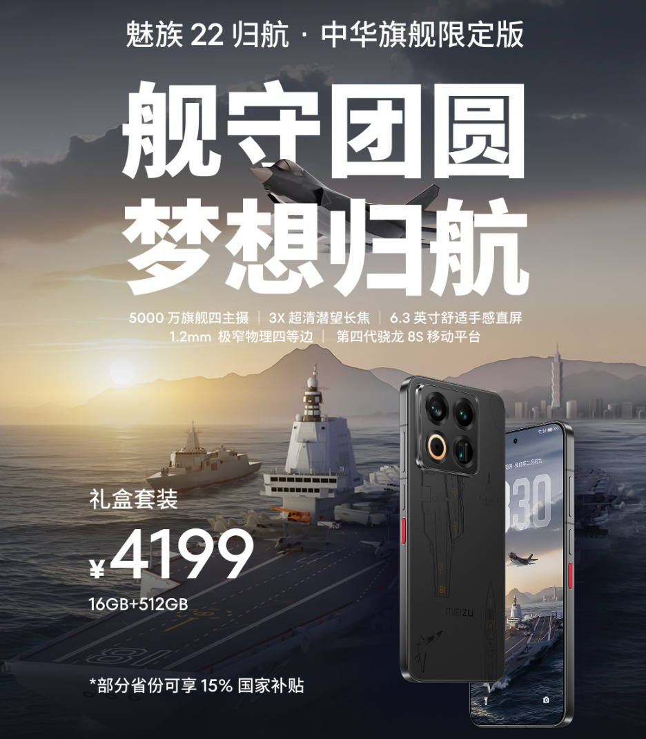 哦對了,發佈會的最後還有一個 One More Thing ,是魅族 22 的 “ 旗艦限定版 ” ,包含了合肥艦、 055 驅逐艦和殲 35 的元素,有定製的系統 UI 、機身背板和周邊禮盒,16GB + 512GB 定價 4199 ,算是對之前魅族 17 航母定製版的致敬。