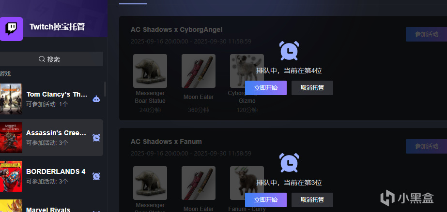綁定完成後回到小黑盒加速器的掉寶工具,找到《AC Shadows》掉寶欄目,再點擊參加,就可以一鍵託管啦!而且還可以同時排隊別的遊戲掉寶活動哦,非常方便!