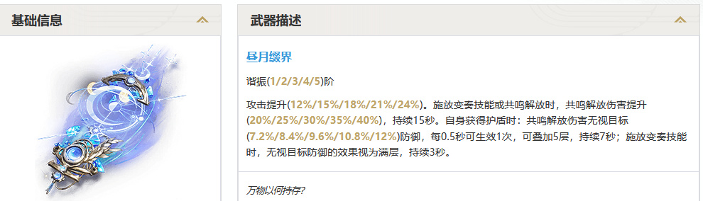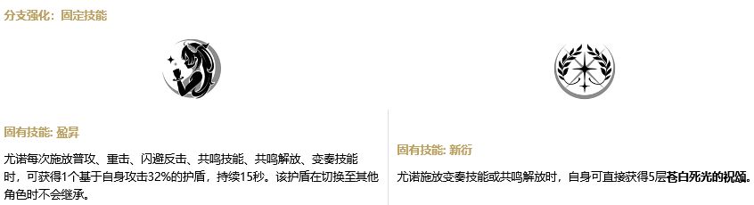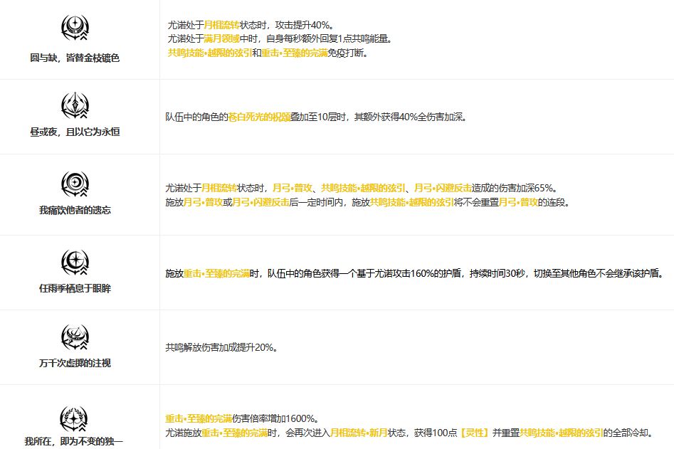 再看固有技能,一个是尤诺释放各种普攻技能时会获得一个护盾,切换角色不继承,另一个是释放变奏和共鸣解放时直接获得5层4%伤害加深。这两者都是偏向自拐的能力,护盾多少并不重要,主要是BUFF的触发器,尤诺攻击带盾就能触发自己4%伤害加深的BUFF,而展开这个BUFF需要我们释放满月领域,这意味着固有技能一主要是为尤诺主C副C形态用;固有技能二是尤诺辅助轴就能直接吃到满层40%全伤害加深,提升辅助轴的伤害。