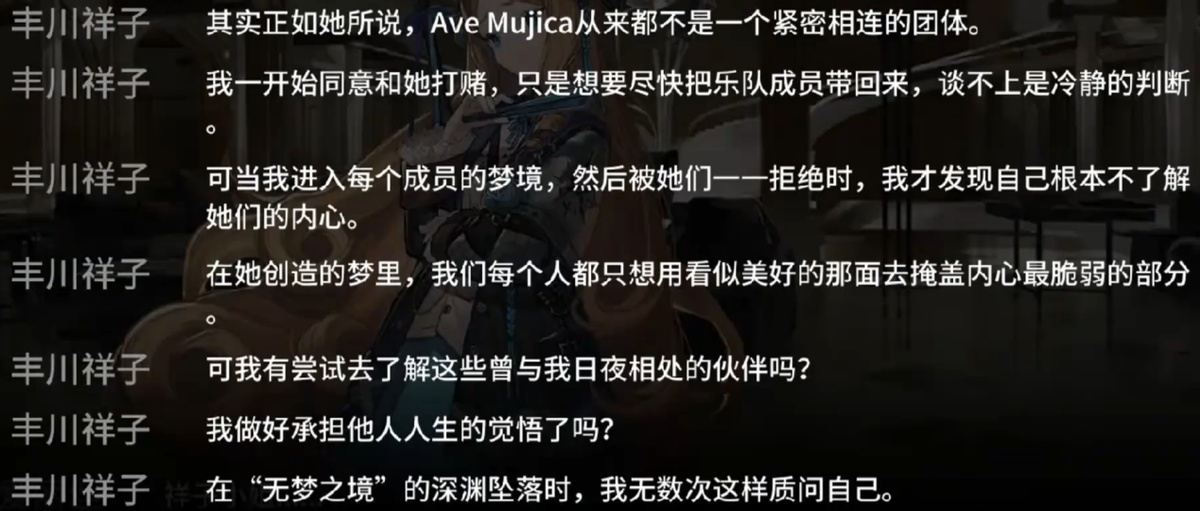 经历过各种梗图以及八面漏风的保密洗礼过后,鹰角终于把各路玩家鸡粉乐子人“期待”良久的《BanG Dream!Ave Mujica》联动版本「无忧梦呓」端了上来,各个二游群顿时像看到孔乙己来到小酒馆,充满了欢快的气息。有上来就检测丰川祥子DPS的,有吐槽祥子恶魔角主人这一块的,认真过剧情看到搞笑巧思马上转来群里的,甚至还有讨论大祥脚的......emmmm,合乎粥礼了说是。