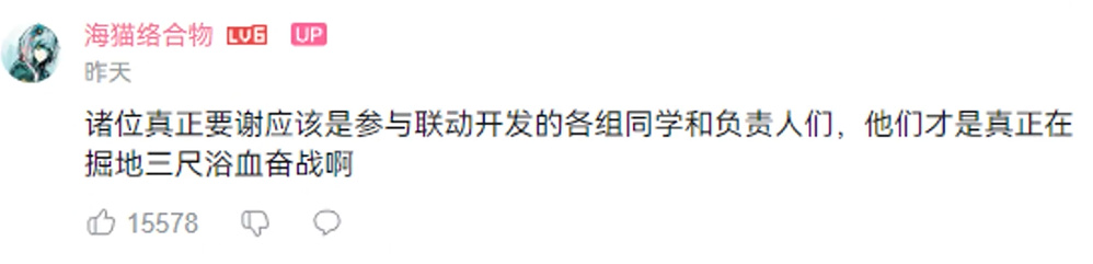 仅仅如此,玩家和原作粉丝们也真是谢天谢地了。一句“谢谢你,海猫”背后真是数不尽的心酸。海猫则表示大家还是谢谢联动开发组的的同学们,不知道他们看了多少遍母鸡卡掘地三尺浴血奋战啊。