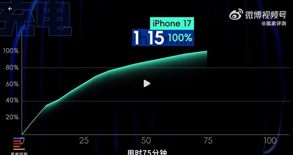 充电方面,iPhone 17充满电耗时75分钟,峰值功率能达到35W,作为对比,iPhone 16标准版充满要耗时102分钟。