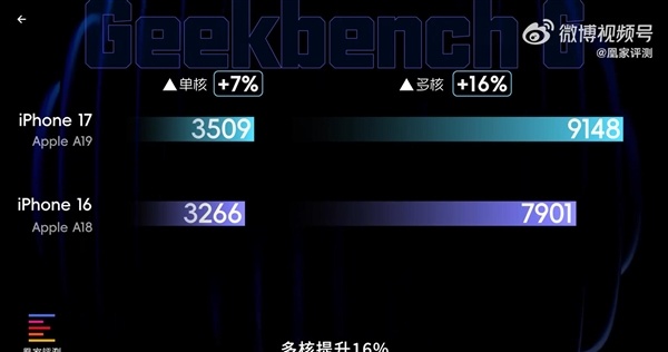 性能方面,iPhone 17搭载A19处理器,其单核成绩对比上代提升了7%,多核成绩提升了16%,GPU性能提升11%,光追性能提升16%。