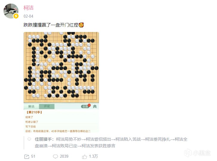 柯潔先是圍甲補賽驚險戰勝了柁嘉熹,取得開門紅,本場比賽正如熱評所言“柯潔局勢不妙→柯潔昏招頻出→柯潔陷入苦戰→柯潔垂死掙扎→柯潔全盤崩潰→柯潔敗局已定→柯潔發表獲勝感言!”雖然比賽期間是一波三折,但好歹是贏下比賽,騎友們期待柯潔能拿下開年三連勝!
