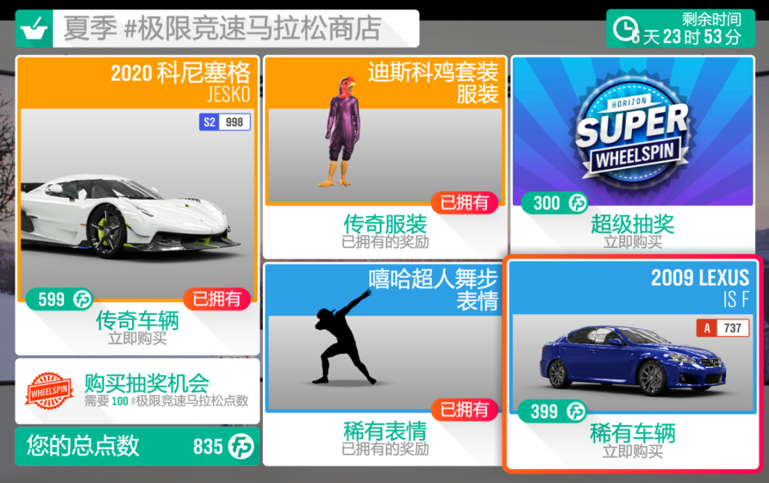 本週更新車輛爲2020款柯尼塞格JESKO和2009款LEXUS IS F,兩輛車都是地平線後臺車,都推薦大家兌換!