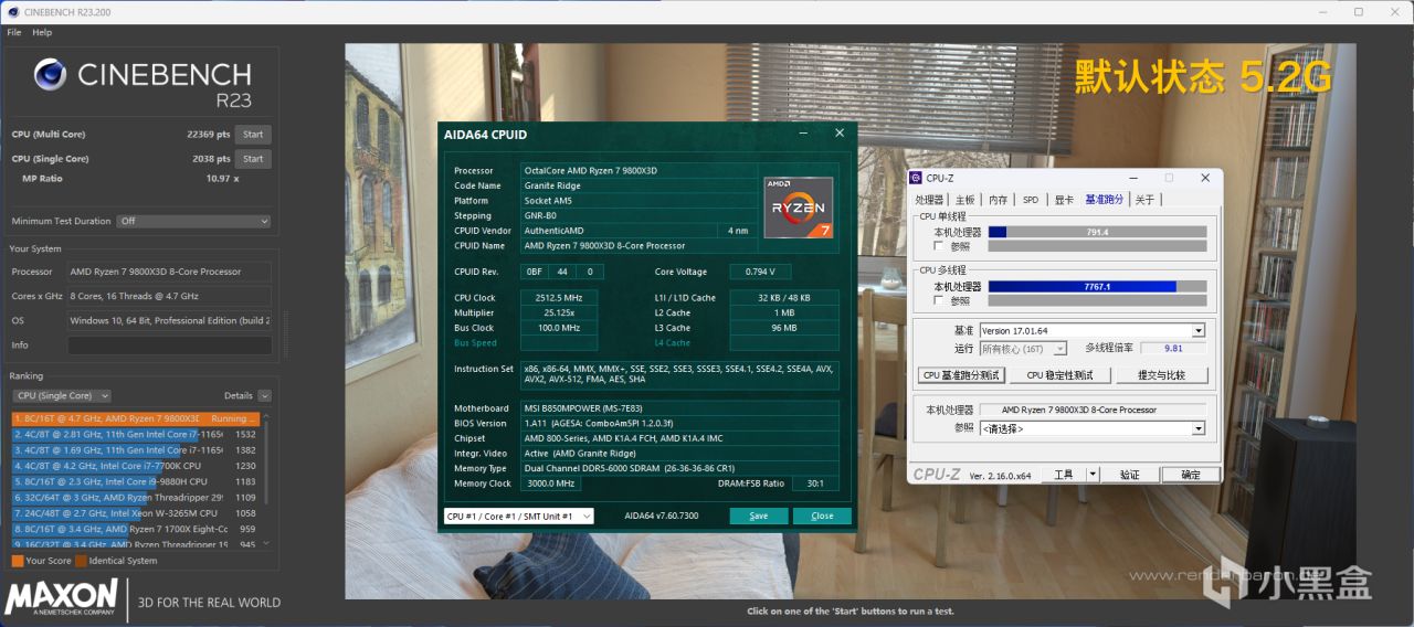 【默频 5.2Ghz】首先是默认5.2Ghz状态下,R23多核跑分为22369,单核跑分为2038;CPU-Z基准跑分单线程为791.4,多线程跑分为7767.1。