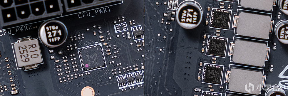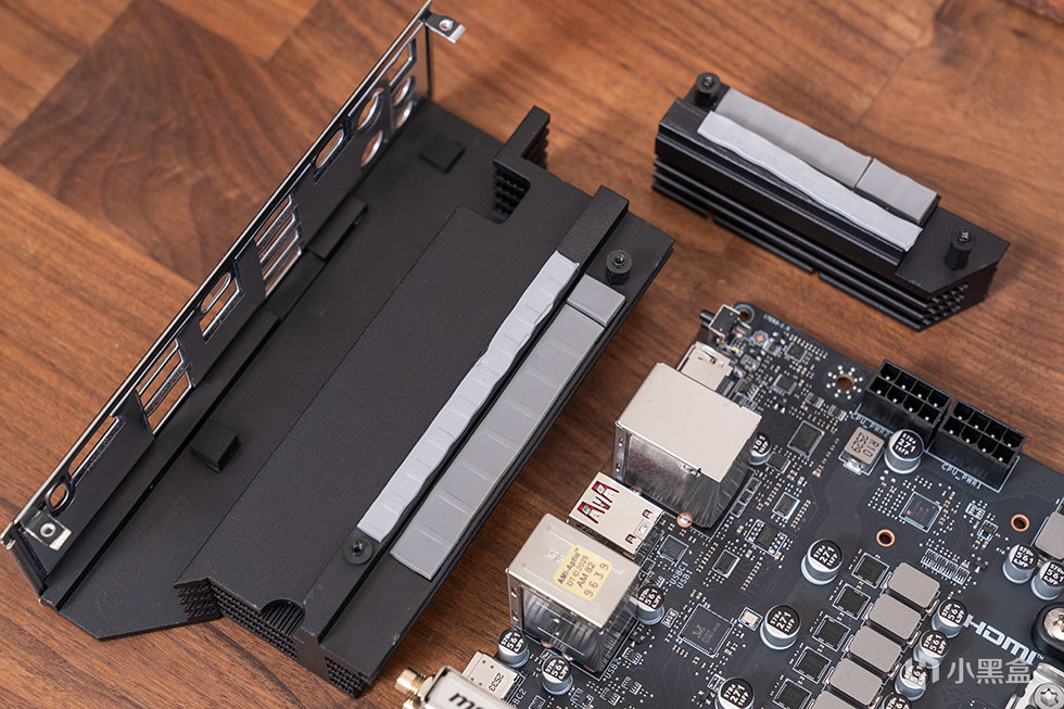 为了保证供电模组能稳定运行,VRM散热装甲配备了多层叠加的金属散热鳍片,通过扩大散热表面积以增强热传导效率。供电模组与散热基座接触面敷设7W/mk高导热系数导热介质,有效提升热交换速率及系统持续负载能力。