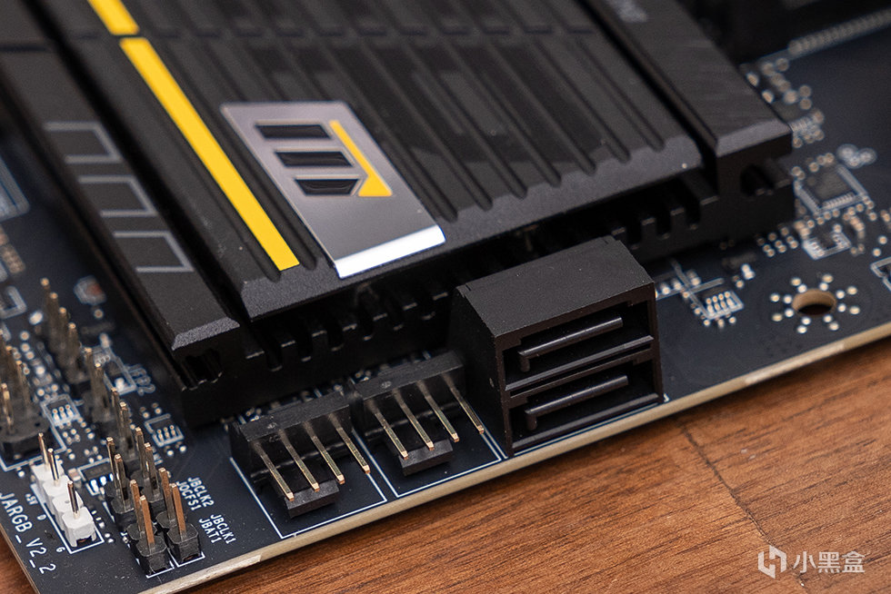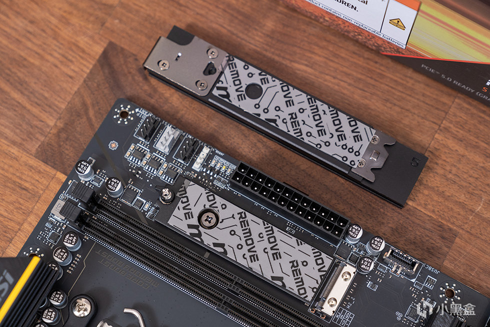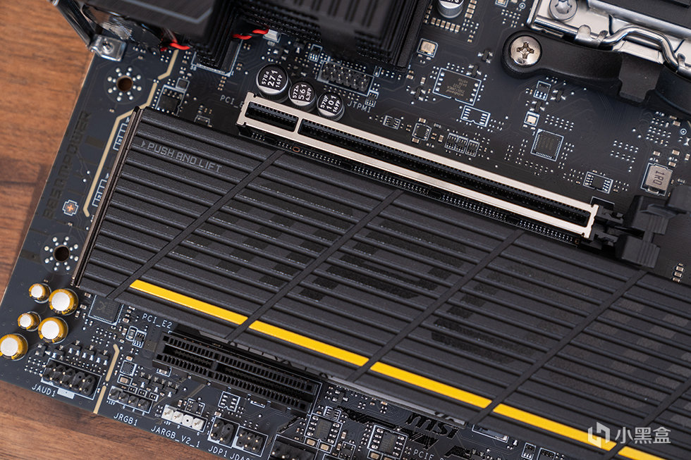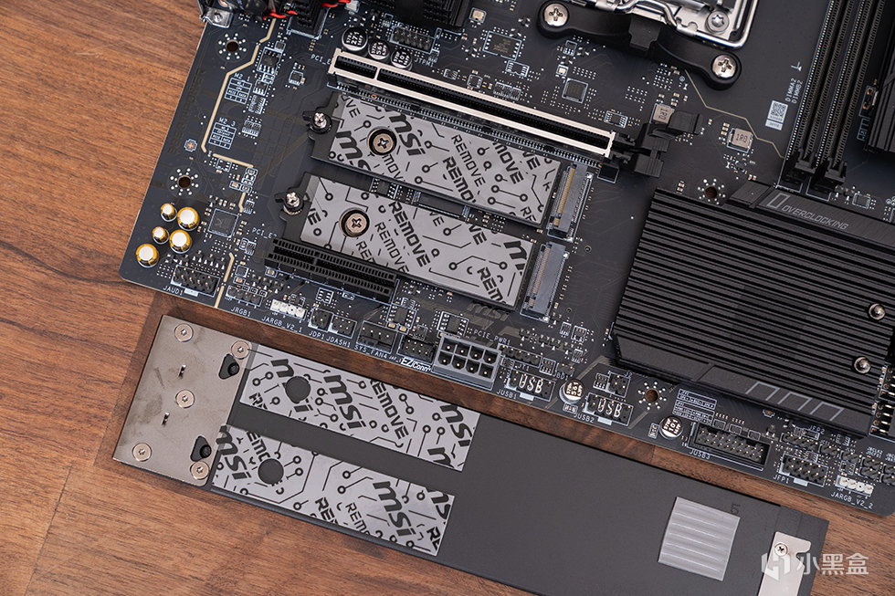 下方的M.2_1和M.2_3两个槽位共用一块大型第二代免工具M.2冰霜铠甲,其中上面的M.2_1槽位来自CPU,为PCIe 5.0 x4规格,下方的M.2_1槽位来自芯片组,为 PCIe 4.0 x4规格。背面的M.2_4槽位,同样来自芯片组,但是规格上为 PCIe 4.0 x2。