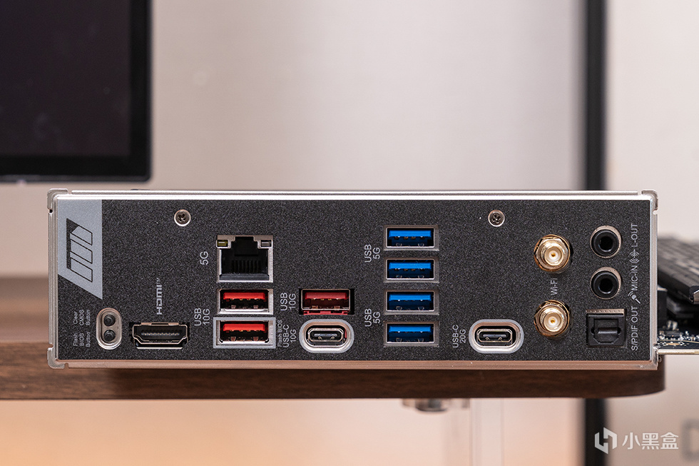 背部IO方面,提供了1个HDMI接口、3个USB 10Gbps (Type-A)、4个USB 10Gbps (Type-A)、1个USB 10Gbps (Type-C)、1个USB20Gbps (Type-C)、1个5G网线接口、1组WiFi 7天线接口、3.5mm音频口、光纤数字音频接口、重置CMOS按键、BIOS更新按键和智能按键。