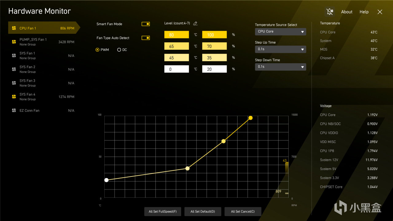 风扇控制选项页面也做了全新调整,提供了多种转速配置,用户可以根据自身的实际使用情况进行选择,当然也可以手动调节转速曲线。