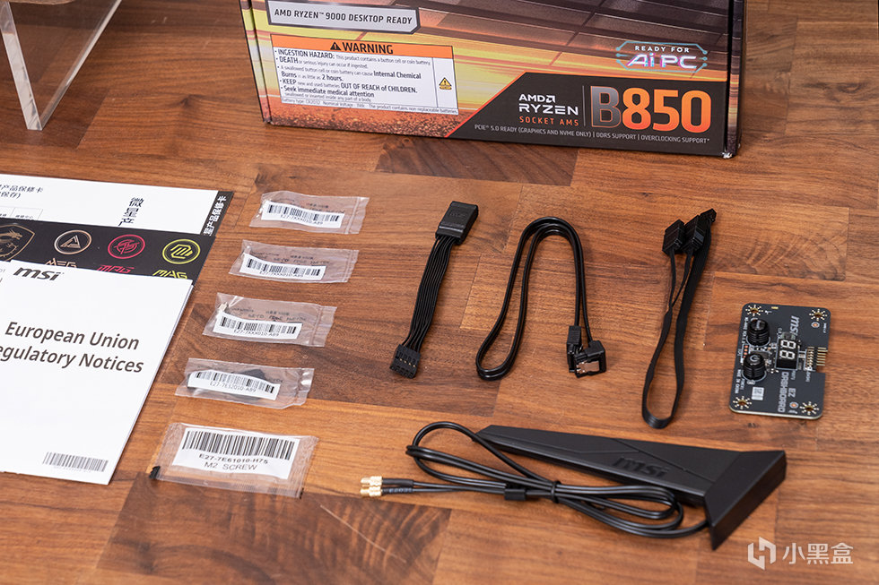 附件方面,包含了一块简易控制面板,一个1个WiFi7天线、1条SATA数据线,1 根 EZconn三合一扩展线,1根 EZ FRONT PANEL 前面板延长线,M.2 硬盘固定螺丝、1个M2 SCREW、1份快速安装指南、1份关于欧盟规管的文件、1张微星信仰标签贴纸和1份 MSI SHOUTOUT活动介绍。