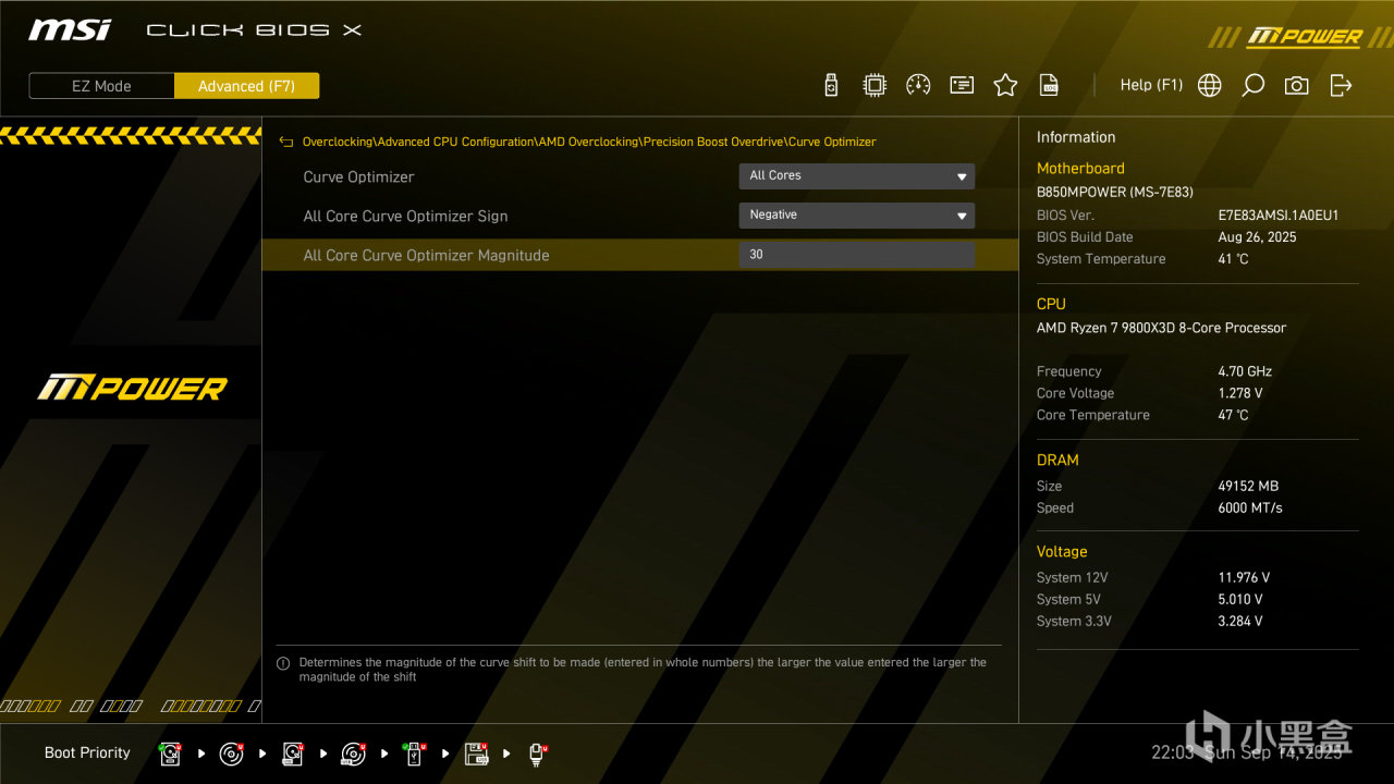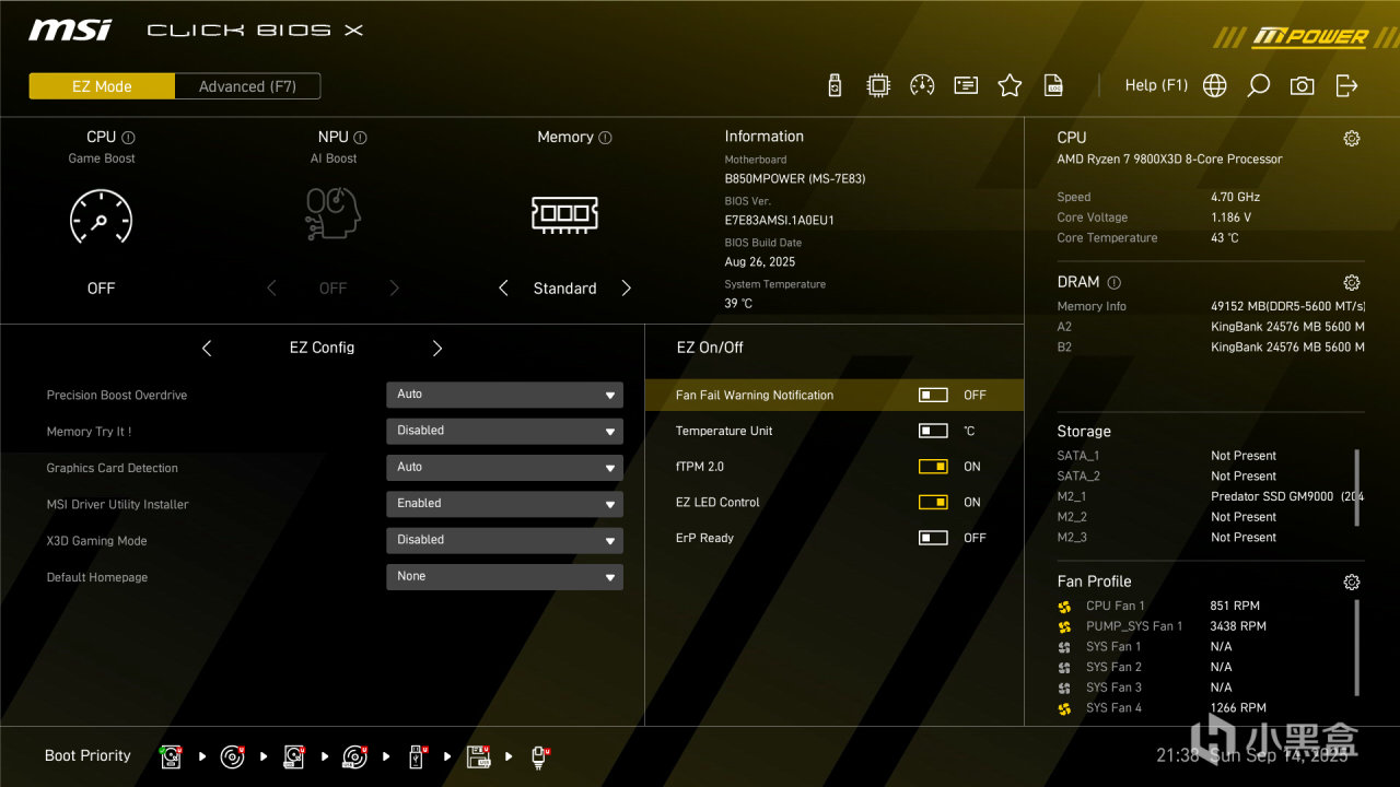 微星针对MPOWER系列设计了全新的CLICK BIOS X 界面提供美观更友善使用体验,让玩家可以更快速存取和调整系统配置。分辨率直接提升至1080P。默认为EZ Mode 简易模式,一般玩家只要在此模式下就可以完成许多设定,例如开启 XMP 、AI BOOST、Game Boost,甚至是 MSI Performance Prest 、Memory Try it等功能,操作便捷。