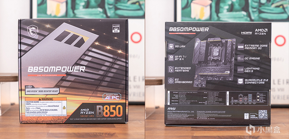 微星 B850MPOWER 主板的包装采用了一贯的黄黑警戒配色,正面只有MPOWER 的铭牌渲染图以及型号名称。在下方则标注了“AMD RYZEN 9000 DESKTOP READY”、“AMD B850”以及“READY FOR AI PC”标识,包装背面则是产品图以及主要特征和参数介绍。