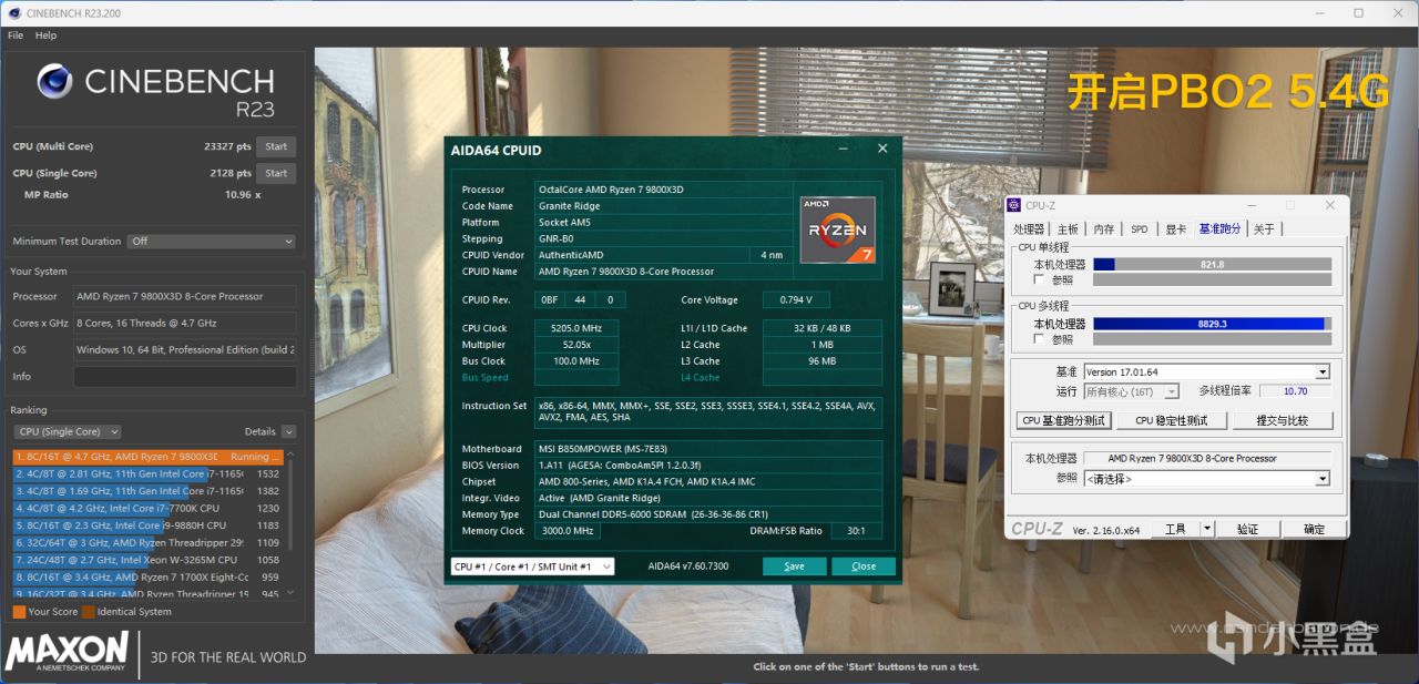 【PBO2 5.4Ghz】接下来在BIOS中开启PBO2,CPU主频增加到5.4Ghz,R23多核跑分为23327,单核跑分为2128;CPU-Z基准跑分单线程为821.8,多线程跑分为8829.3。相较于默认状态,性能分别提升了4.28%、4.42%、3.84%、13.68%