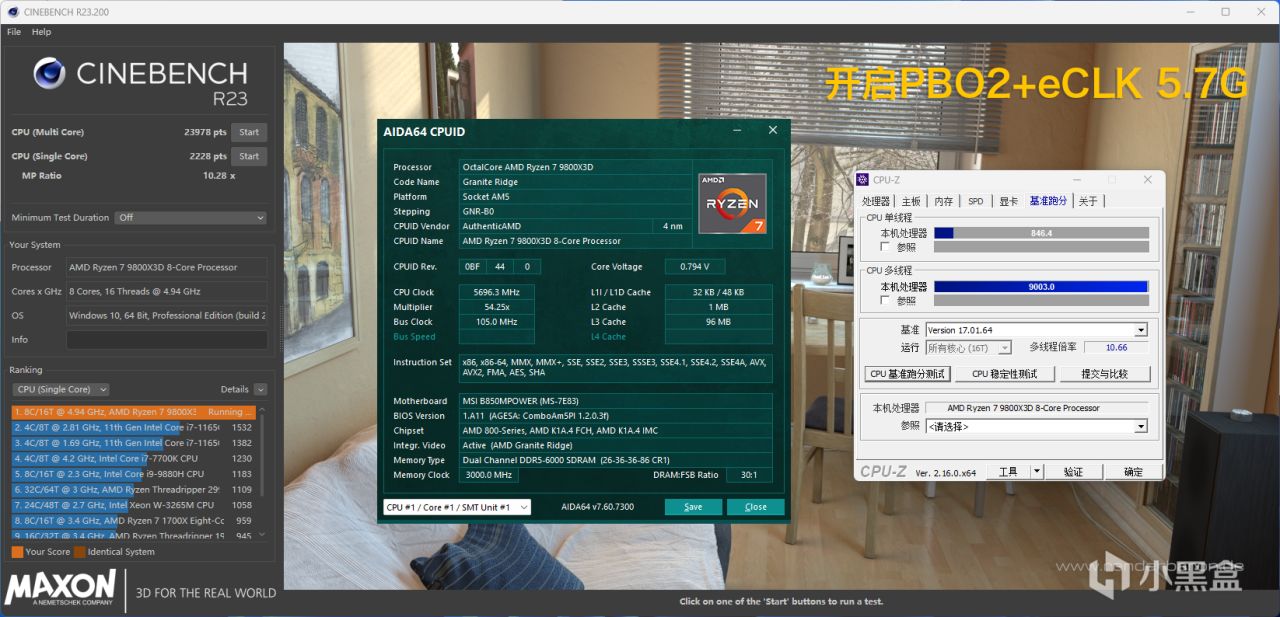 【PBO2+eLCK 5.7Ghz】微星 B850MPOWER 相对一般的B850M主板来讲,多了内置的时钟发生器,所以可以对CPU进行外频进行调节,就以9800X3D为例,开启eCLK Mode后,选择异步模式,外频可以一般在105-107范畴之内,极品体质也可以到108或者109,大家可以根据自己手上的CPU体质而定,我这里直接以最为稳妥的105为例。开启后主频达到了5.7Ghz,此时R23多核跑分为23978,单核跑分为2228;CPU-Z基准跑分单线程为846.4,多线程跑分为9003。相较于默认状态,性能分别提升了7.19%、9.3%、6.95%、15.91%