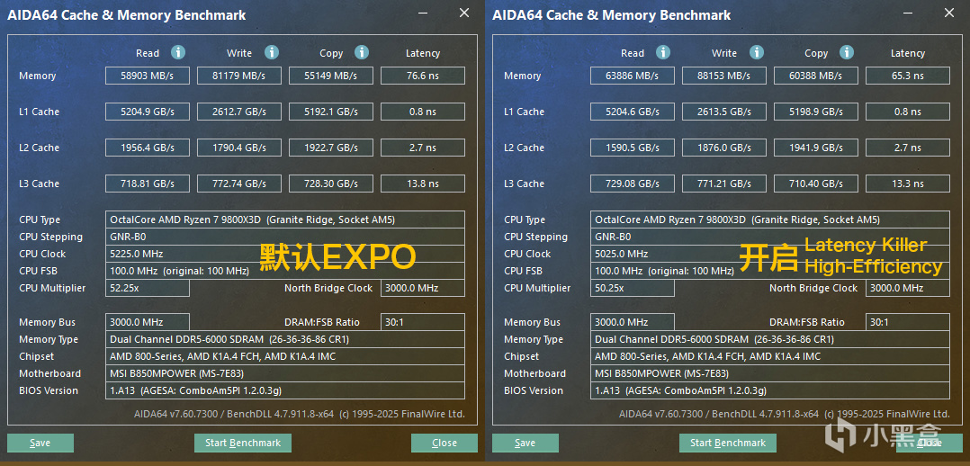 第二项是内存测试,通过AIDA64内存及缓存测试显示当前AGESA版本仍存在较高延迟。经微星独家的Latency Killer和High-Efficiency技术优化后,可观察到内存延迟由76.6纳秒显著降至65.3 ns,读取、写入及复制带宽性能均实现明显提升。