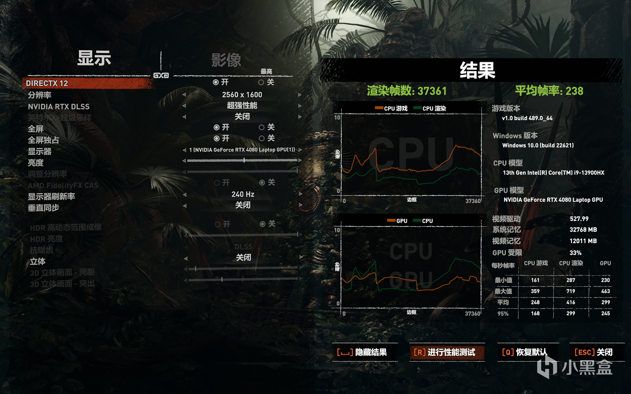 《古墓丽影9》2560x1600分辨率特效全开,平均帧数238FPS,基本喂饱240Hz电竞屏。