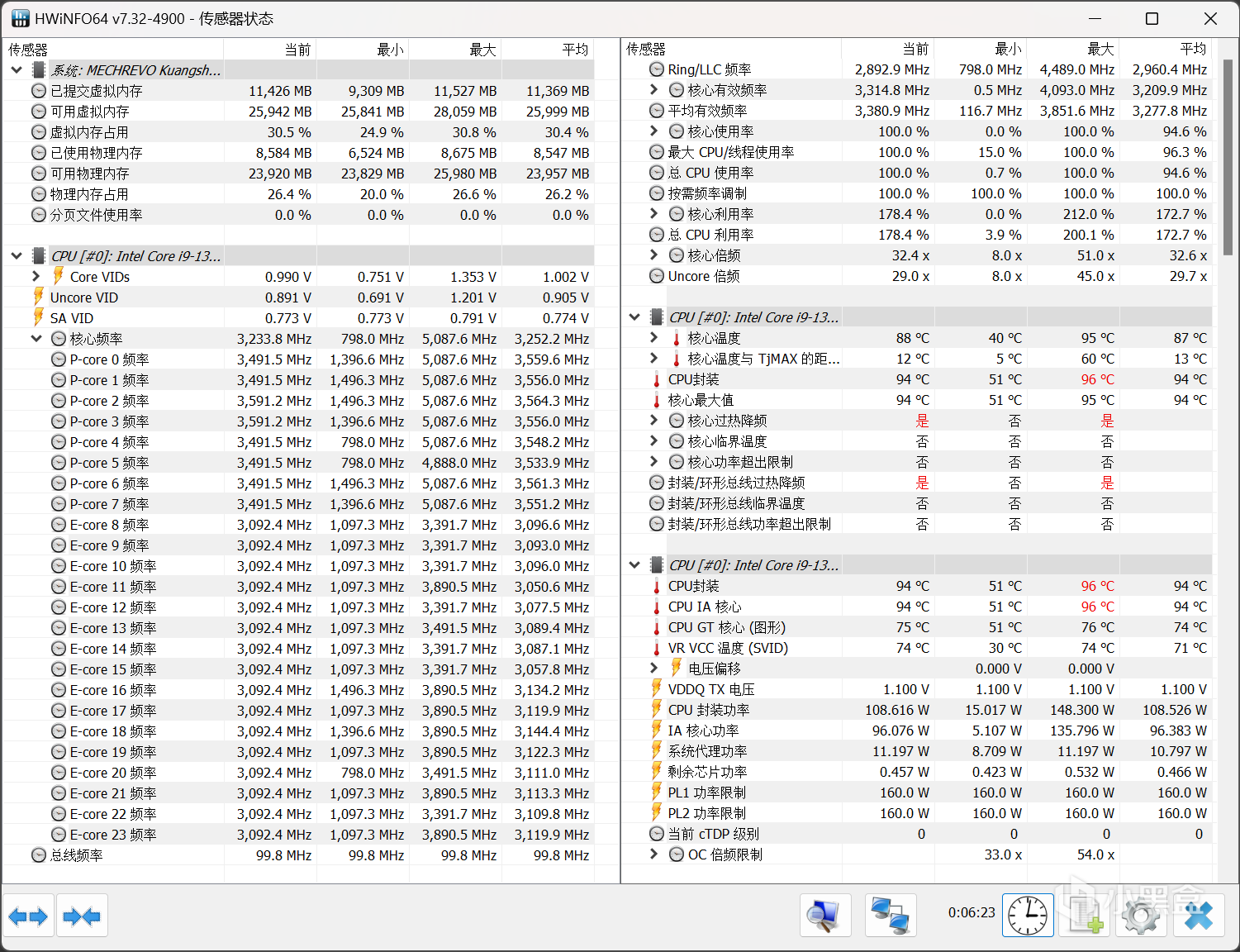 HX55平台的第13代酷睿i9-13900HX说白了就是Intel把台式机上的CPU移至到了笔记本中,因此在规格与性能表现上远超以往的H45处理器。8P+16E共32线程的规格与台式机i9如出一辙,CPU-Z BENCHMARK单线程分数859.5、多线程13857.3。