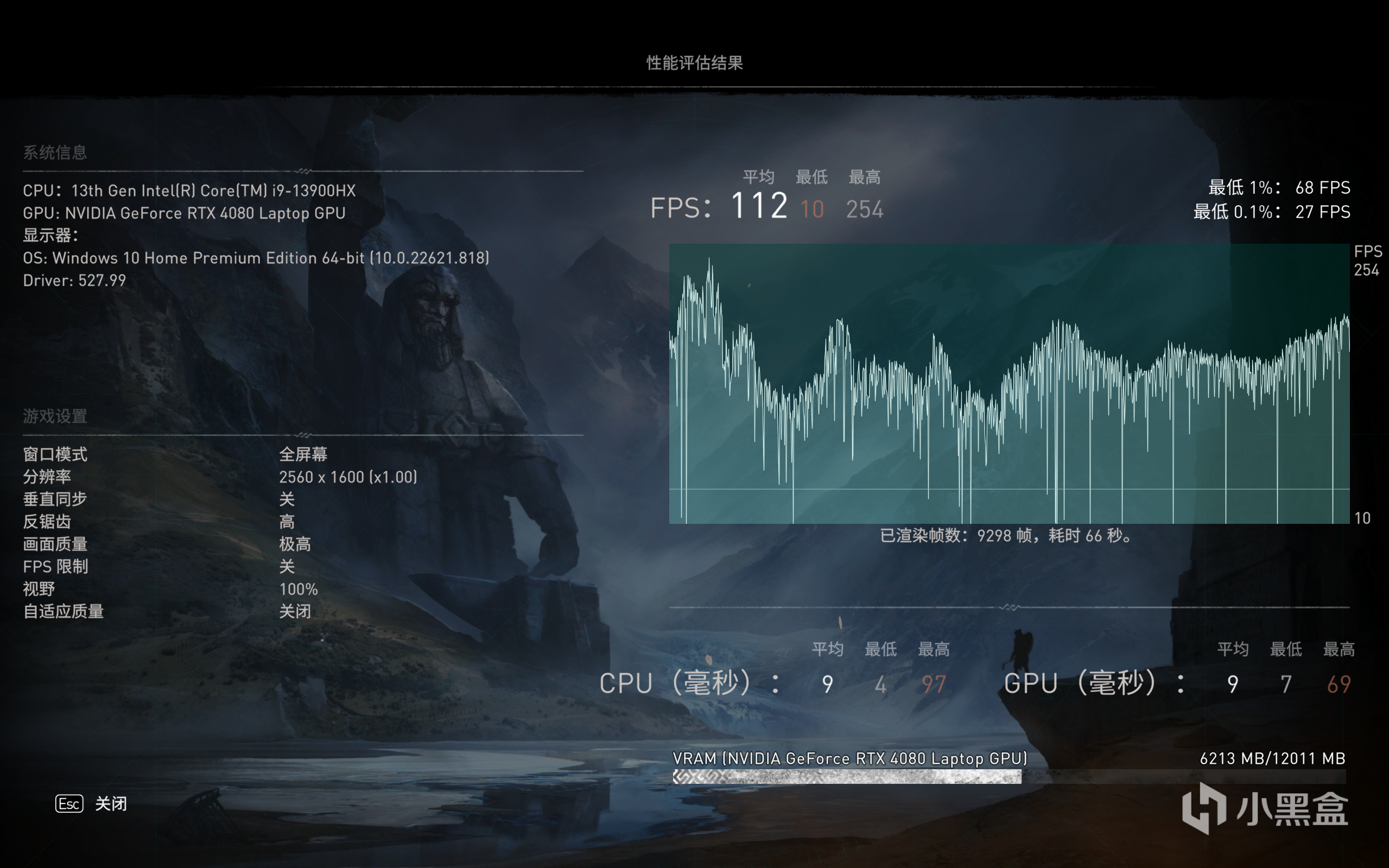 《刺客信条:奥德赛》2560x1600分辨率特效拉满,平均帧数达到了112FPS。