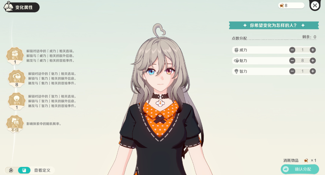 毫不夸张的说,《崩坏:因缘精灵》副本式的CRPG体验非常完整和流畅。游戏为了匹配该玩法,直接将主角的数值简化为“威力”“魅力”“智力”三个方面。玩家可以将十点数值自由的进行分配,也可以在后面使用道具调整,而不同的加点方式会直接影响游戏中某些选项的出现。