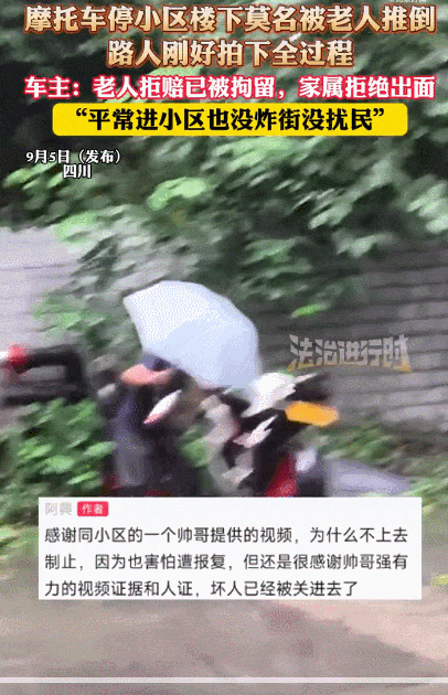 近日,四川。重约215公斤的摩托车停小区楼下莫名被老人推倒,路人刚好拍下全过程,车主刘先生表示:“老人连推两辆摩托车,家属拒绝出面,自己平常进小区也没炸街没扰民。”