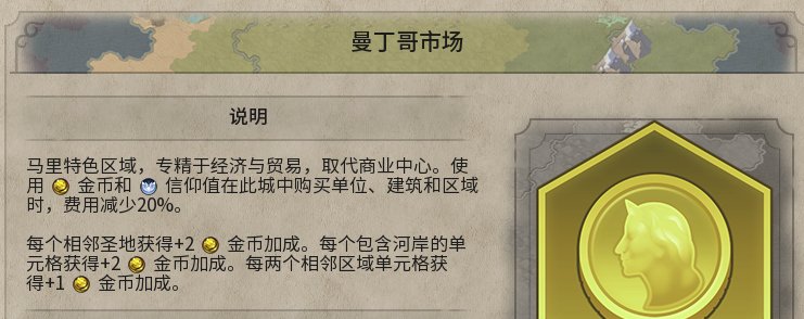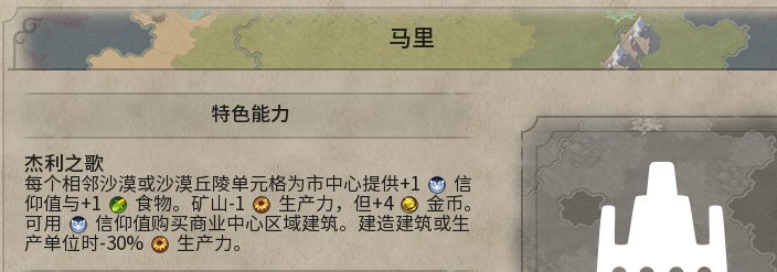 最后说一个典型文明马里,马里发教是真没有任何道理的,马里出区域建筑本身就有debuff,更别说改矿还-1锤。马里优势在于商路和曼丁哥市场,出圣地等于上七人口才能出商业区域,再算上debuff,发教发职业道德也不知道得拖多久才能补学院和商业。不如直接学商开,回合金换金币,买建筑滚雪球。用大佬话来说,马里就剩钱多了,买就完事了。 马里,就是一个典型的国力文明,我们主要是要把马里的国力转化为数据,而不是发教继续种国力。