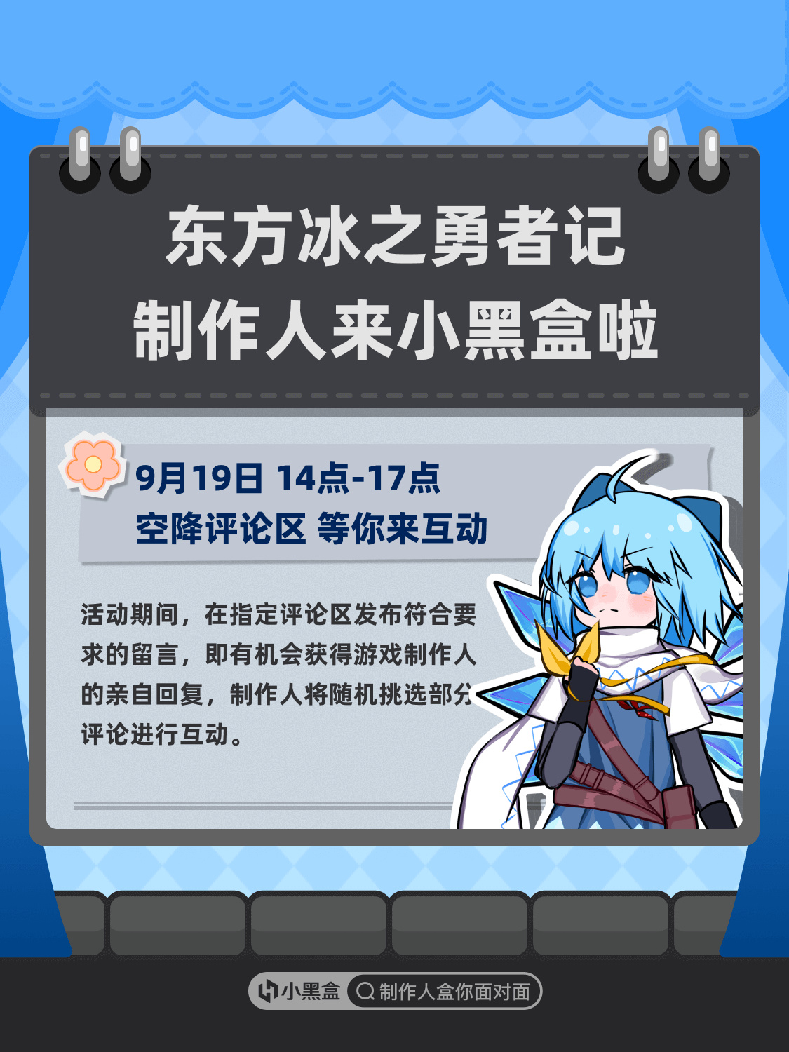 在《制作人盒你面对面》活动中,我们将每期邀请一个游戏制作人在指定内容的评论区中与用户进行评论互动,你将有机会与游戏制作人在线互动,了解游戏背后的故事。本期邀请到的游戏制作人所属游戏为《东方冰之勇者记》。