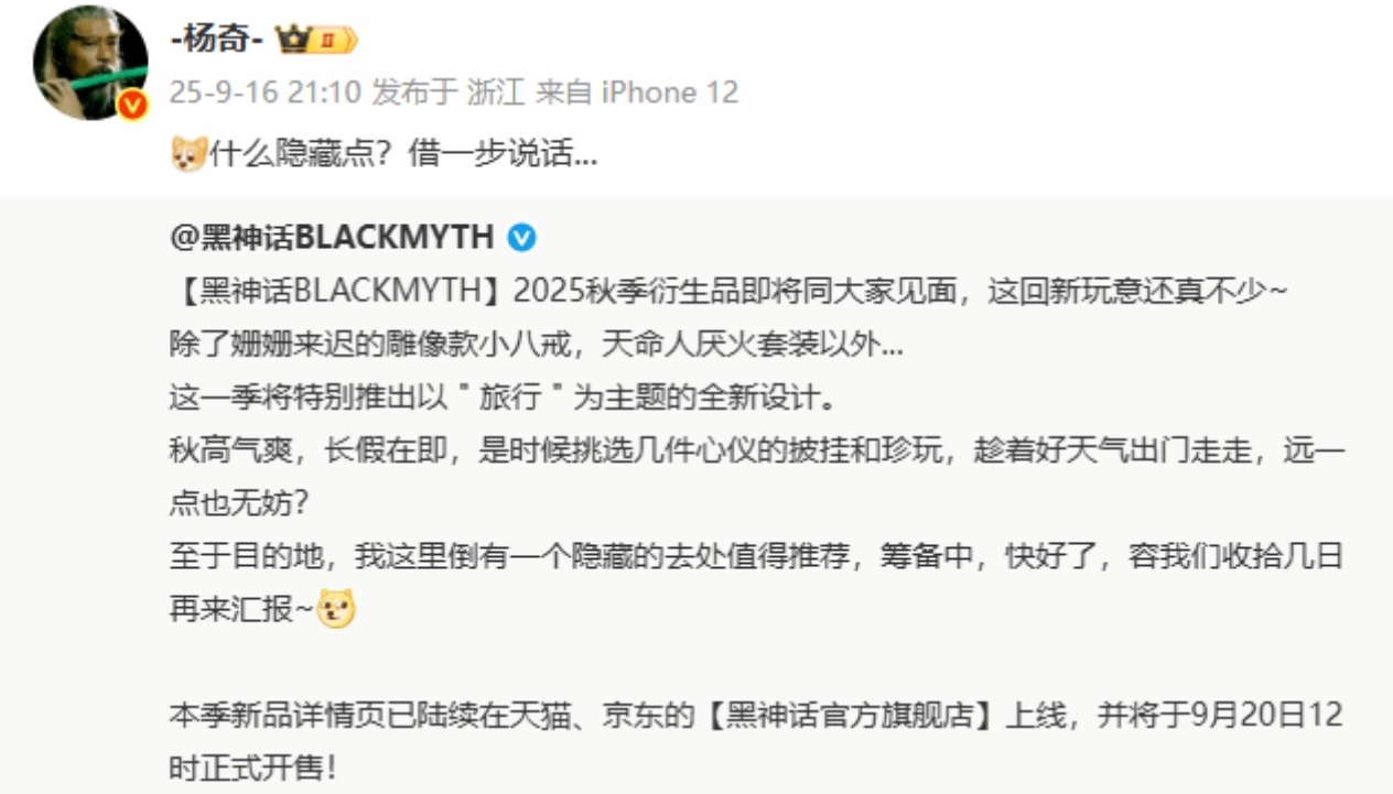 这与此前《黑神话》官方品牌的公告相呼应。官方宣布2025年秋季将推出大量新品,包括雕像款小八戒、天命人厌火套装以及以“旅行”为主题的全新设计,并透露正筹备一个“隐藏的去处”。杨奇对此调侃道:“什么隐藏点?借一步说话…”并透露新品的黑色葫芦设计可用于喝水。网友推测这可能暗示官方主题咖啡店或艺术展览空间。此前瑞幸咖啡与《黑神话:悟空》的联名大获成功,此次杨奇发布的咖啡图片再次引发对品牌联动的猜测。关于装修场地,杨奇曾称“家里装修”,但玩家更愿意相信这与游戏未来内容或官方活动相关。