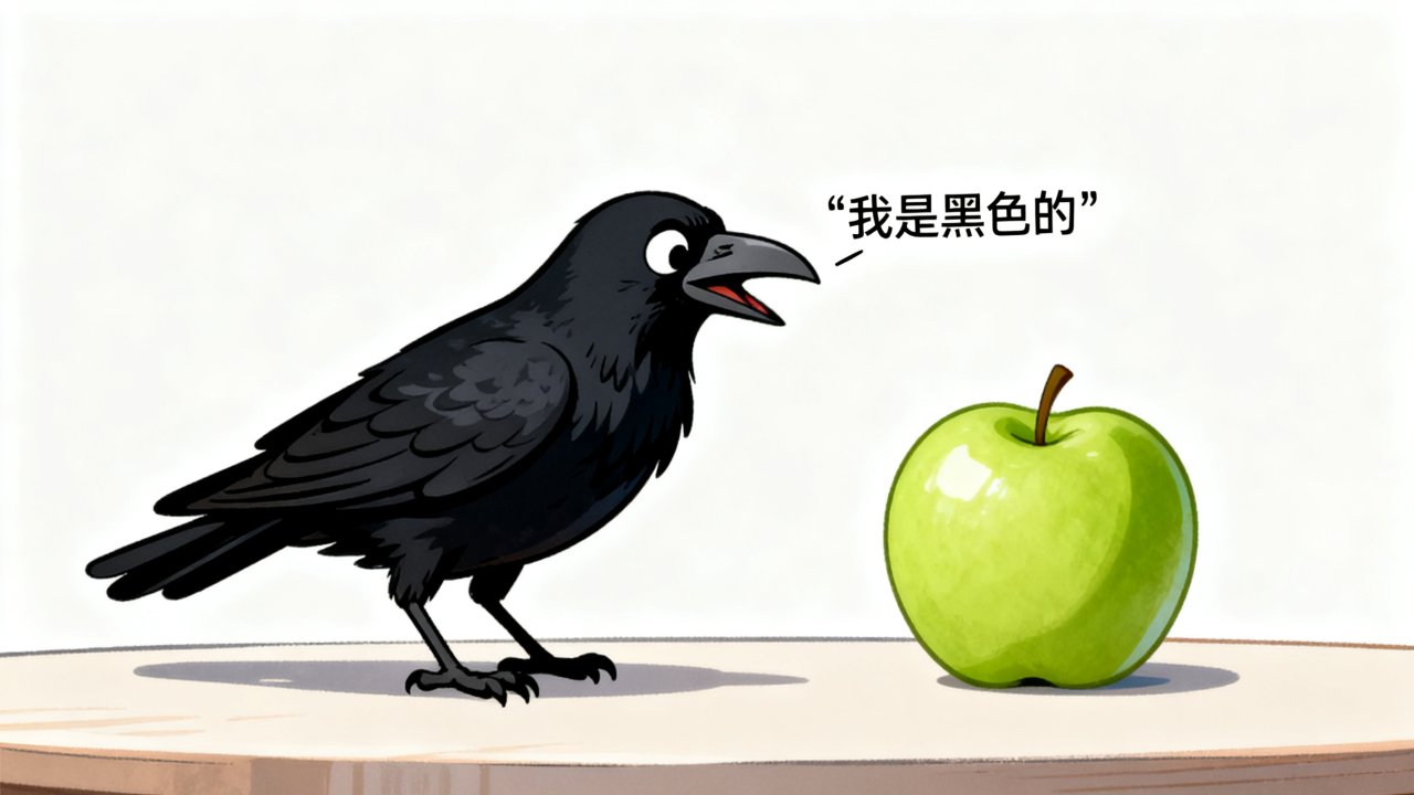 ②逻辑逆否命题:这条定律在逻辑上等价于:“所有不是黑色的东西,都不是乌鸦。”所以,如果你找到一个不是黑色的东西(比如一个绿色的苹果),并且它确实不是乌鸦,那么原来的定律“所有乌鸦都是黑色的”提供了微小的支持。